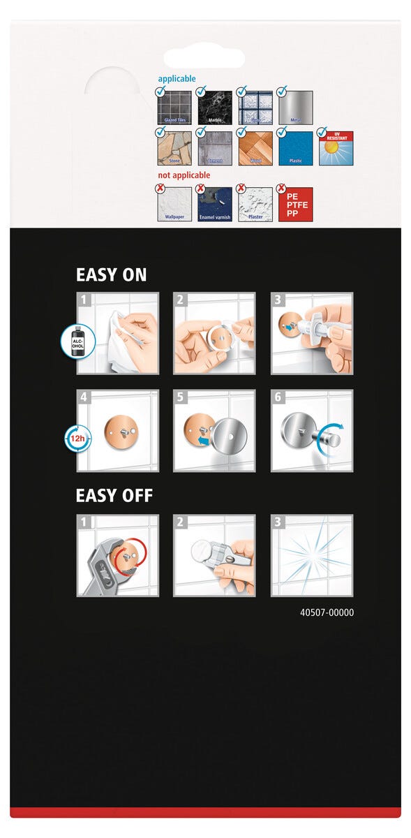 • Kan festes på naturstein, metall, fliser, glass, tre, marmor, betong og flere typer plast.