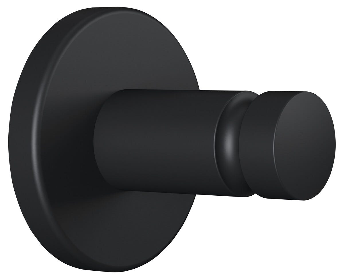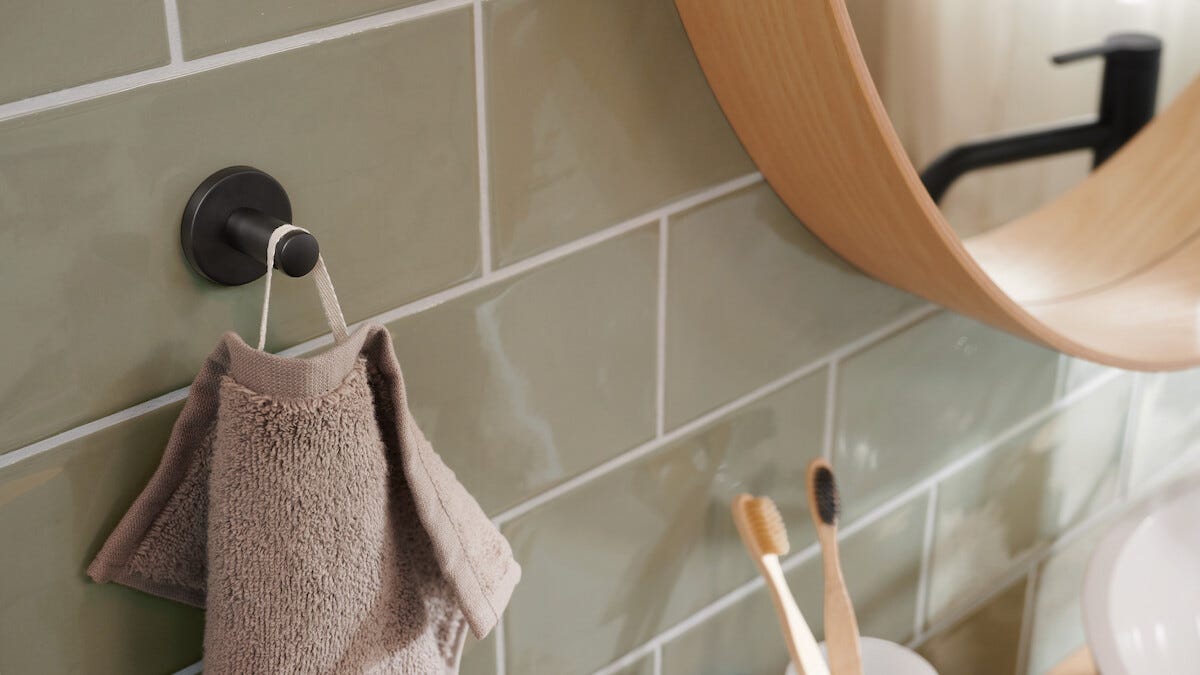 • Liten, svart håndklekrok – selvklebende metallkrok.