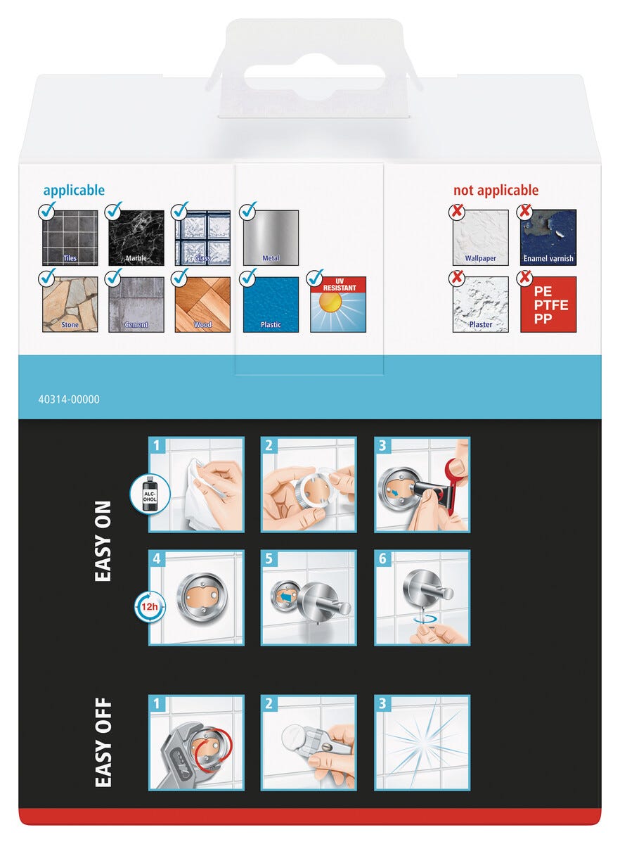 • Kan festes på naturstein, metall, flis, glass, tre, marmor og diverse plast.