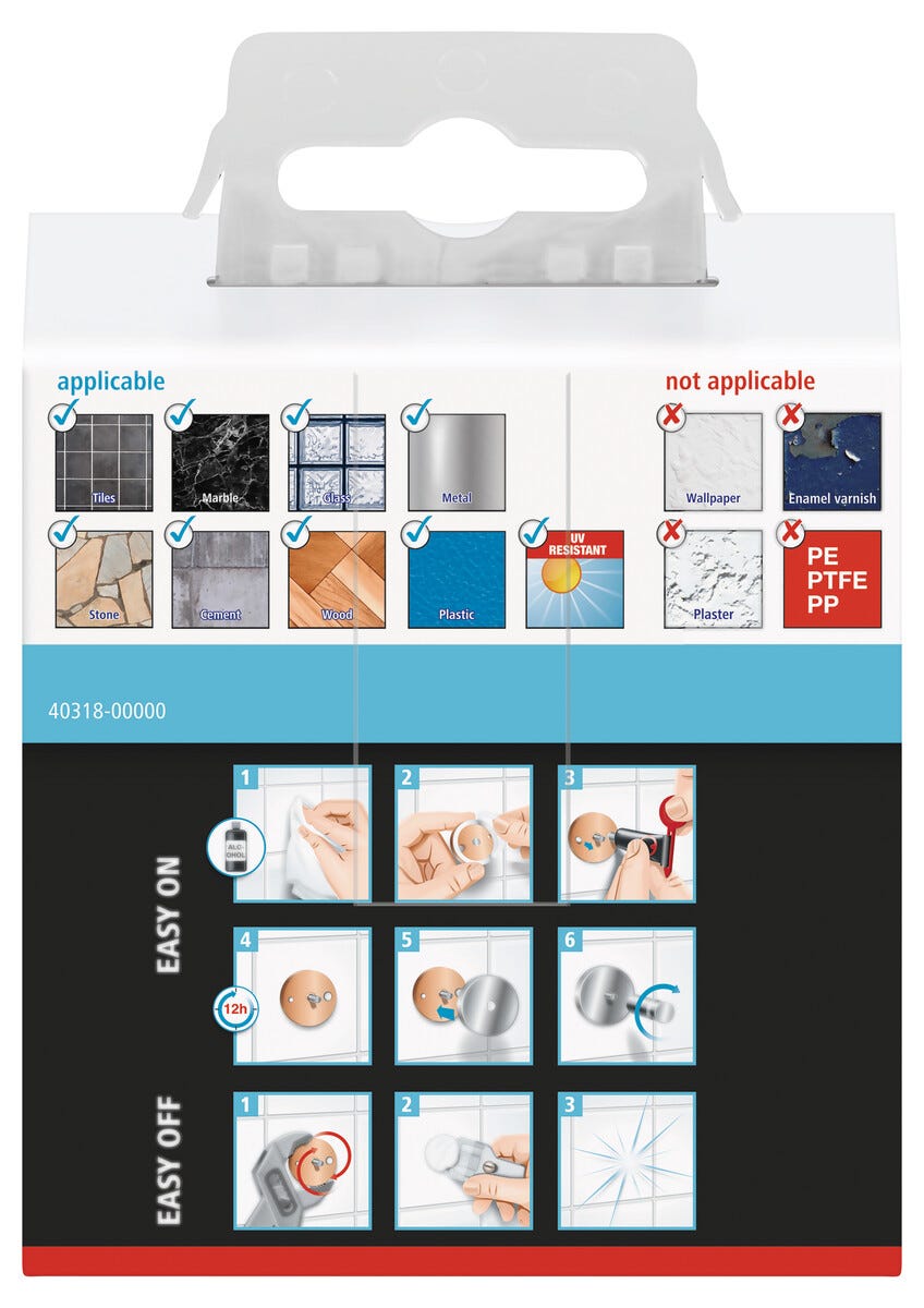 • Kan festes på naturstein, metall, flis, glass, tre, marmor og diverse plast.
