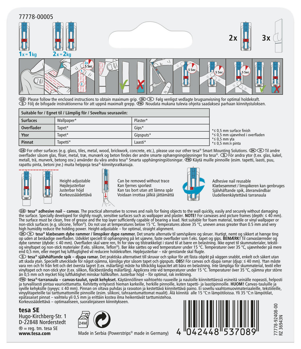 • Selvheftende spiker som sitter sikkert og er enkle å flytte.