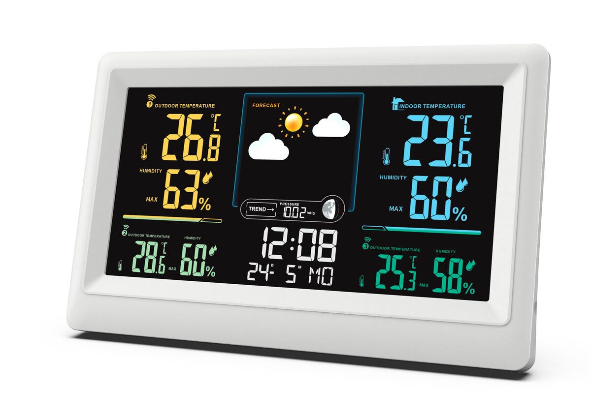 • Værstasjon med værprognose, lufttrykk, tid, vekkerklokke og bakgrunnsbelysning.