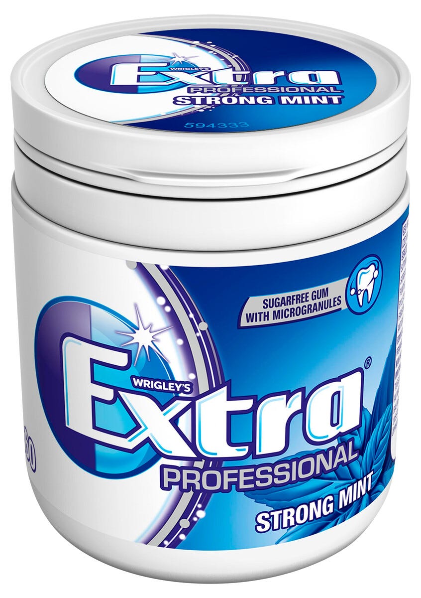 • Extra Pro Strongmint er gelatinfritt og er dermed en vegansk tyggegummi.