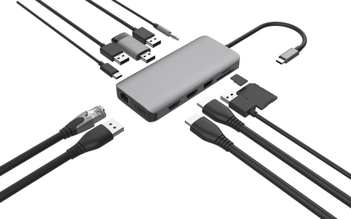 • 12-i-1 USB hub – komplett dockingsstasjon til bærbar datamaskin.