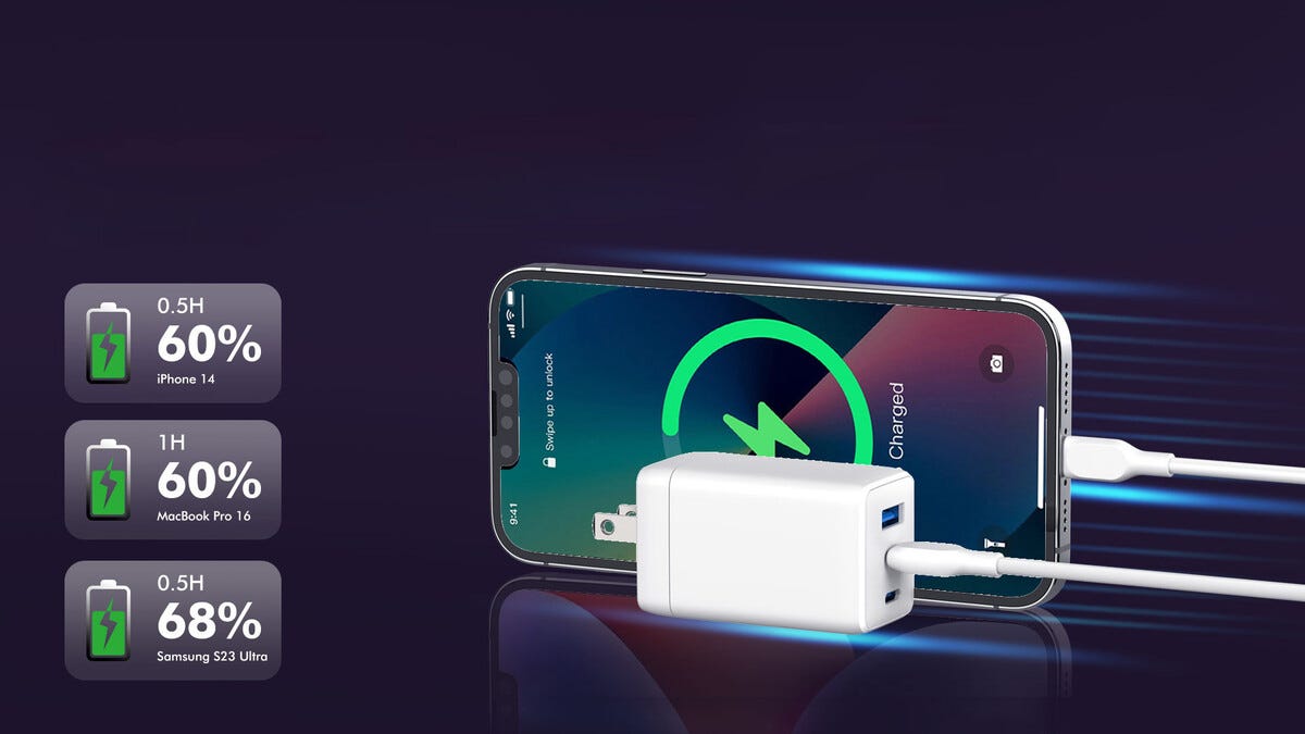 • Kraftig GaN-vegglader med to USB-C-porter og én USB-A-port.