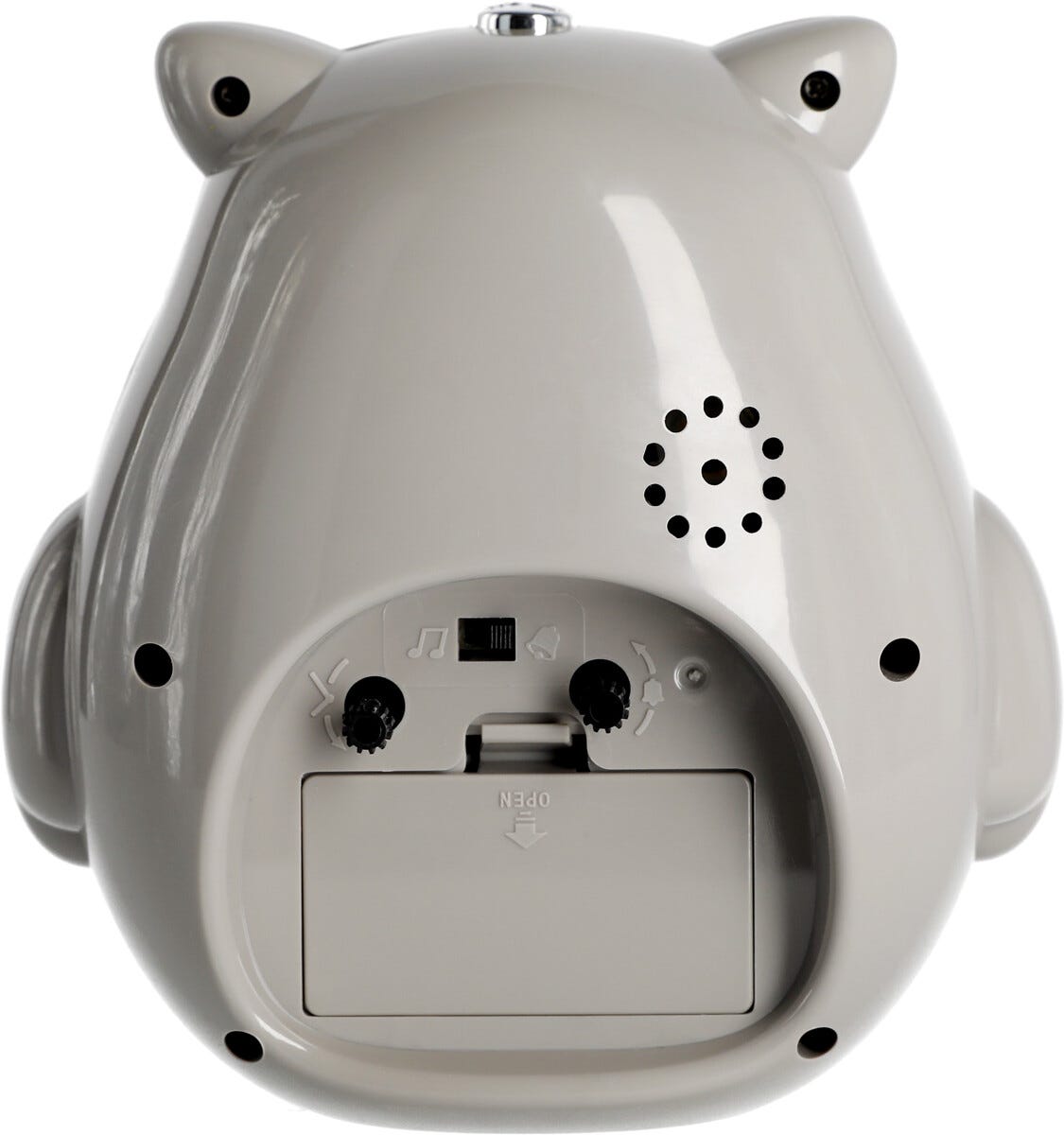• Analog vekkerklokke formet som en ugle med hvit urskive og lettleste grå sifre.