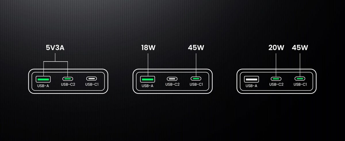 • 2 stk. USB-C og 1 stk. USB-A – med vern mot kortslutning, overoppheting og overbelastning.