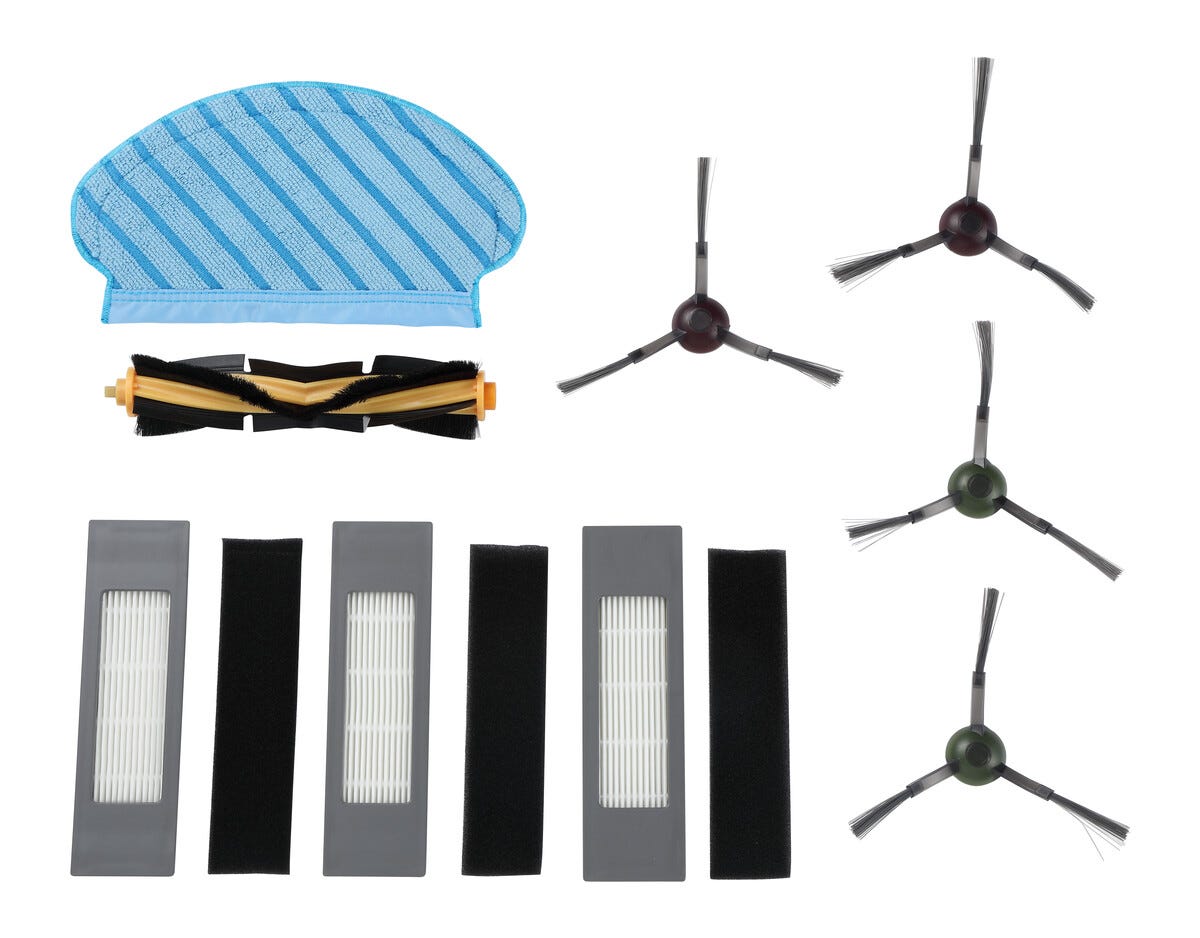 Tilbehørssettet inneholder 3 filtersett (3 hovedfiltre + 3 forfiltre), 4 sidebørster, 1 hovedbørste og 1 moppklut.