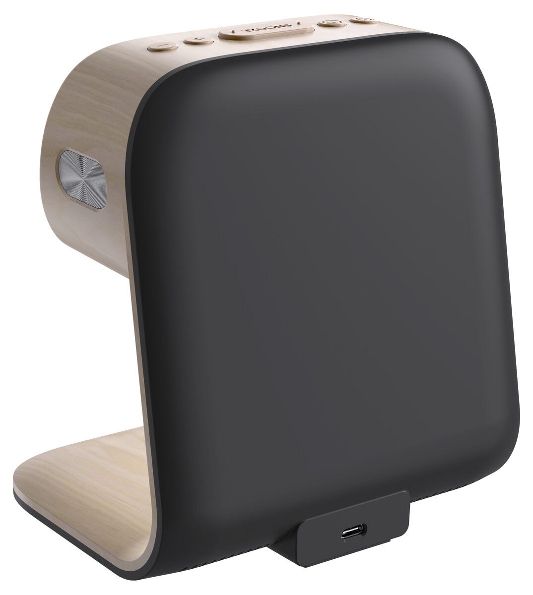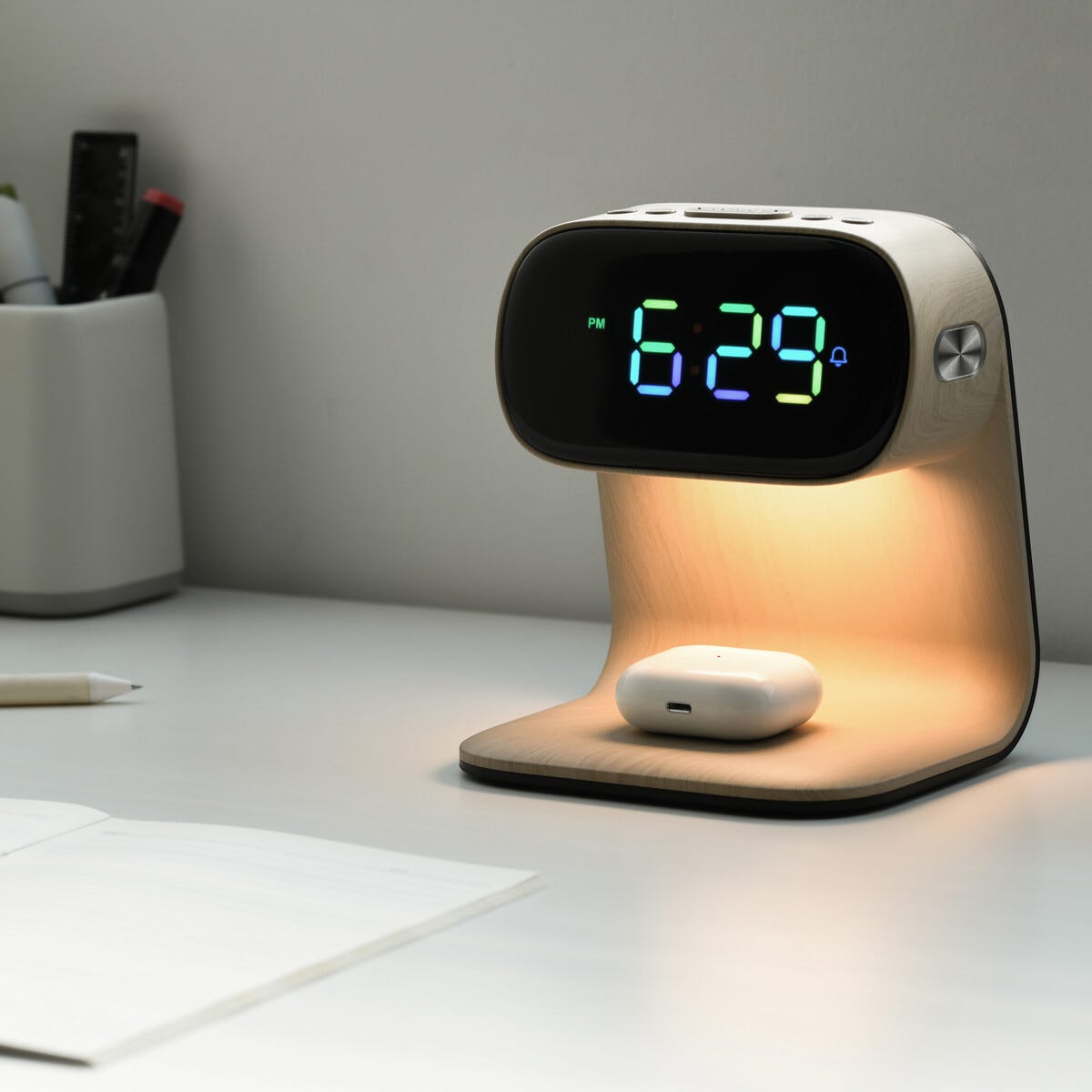 • Digital vekkeklokke med innebygd trådløs Qi-lader for mobil og hodetelefoner.
