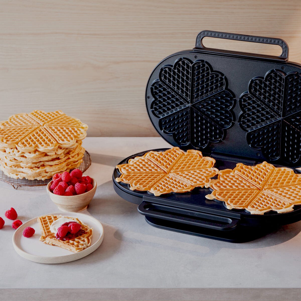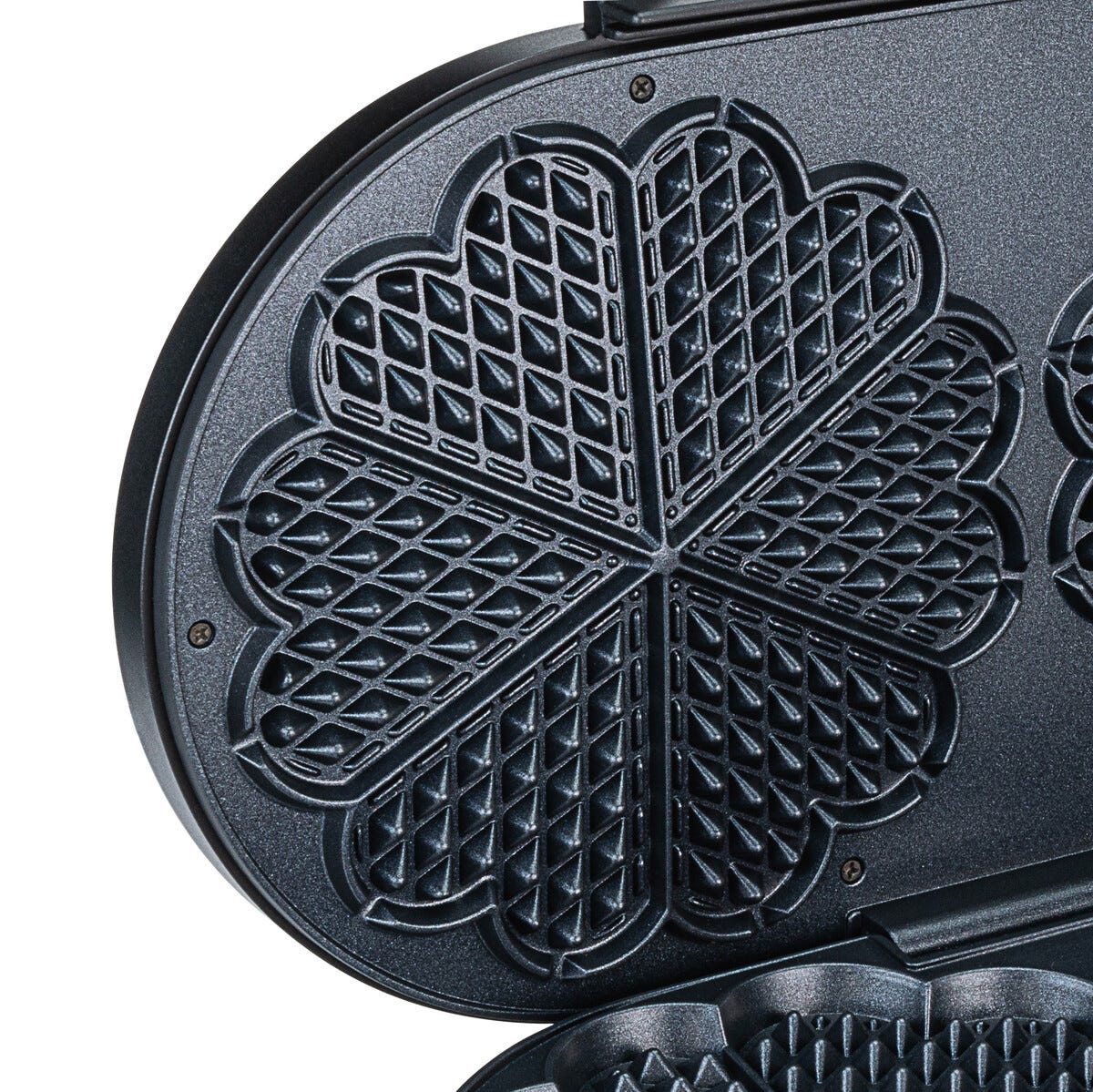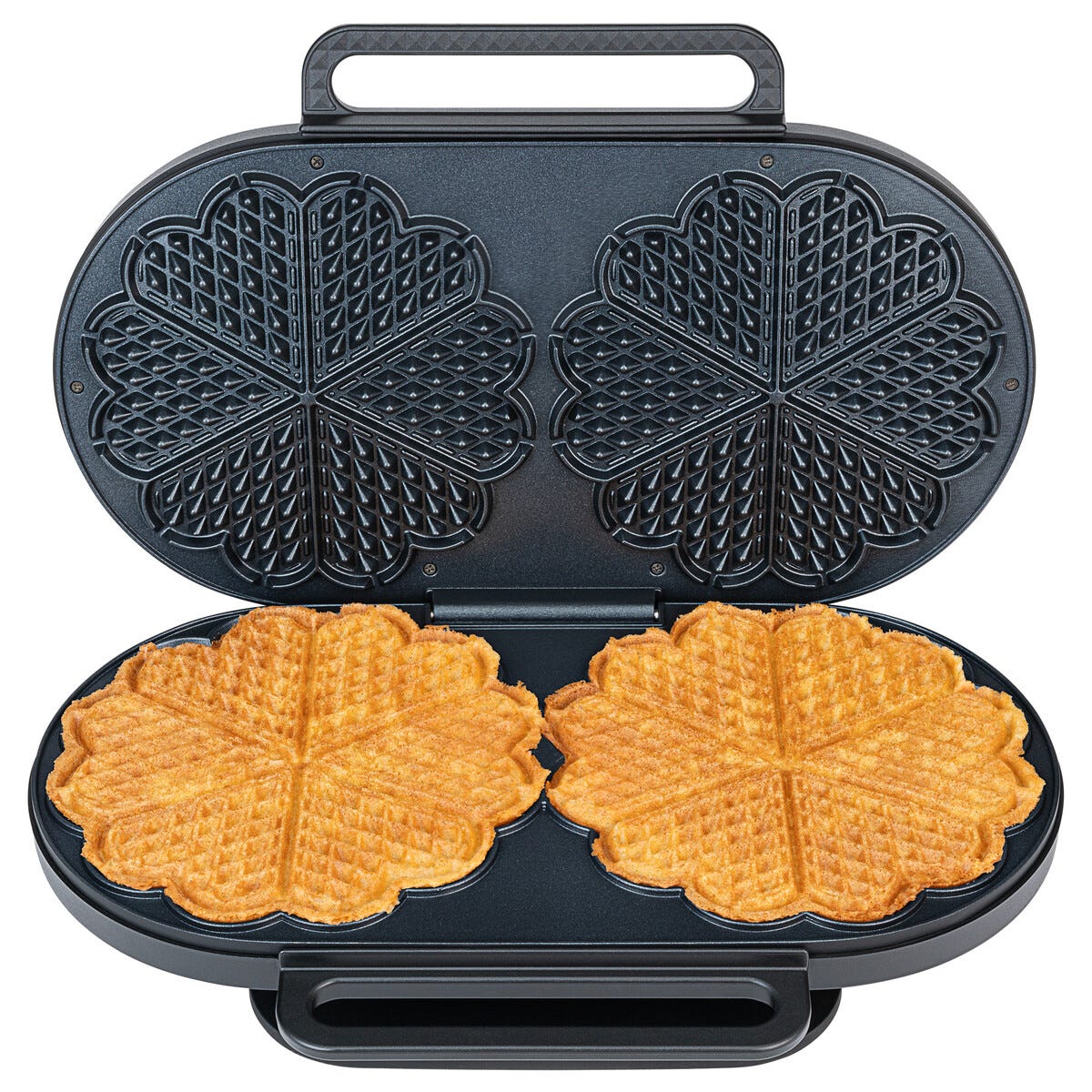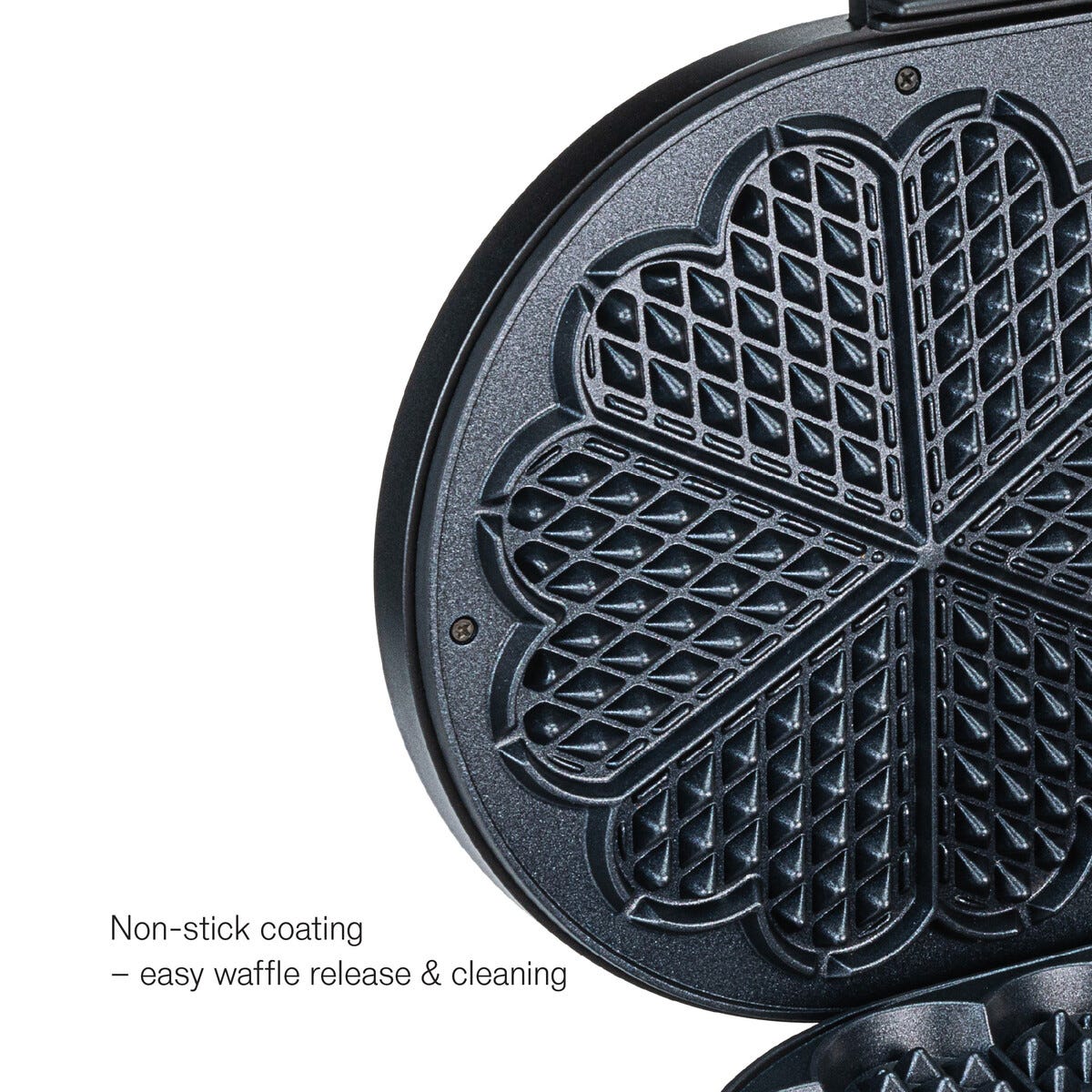 • Steker 2 store vafler samtidig – 2 x 6 hjerter, 22 cm i diameter.