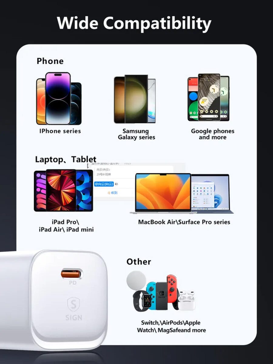 • SiGN USB-C hurtiglader 30 W – passer til de fleste smarttelefoner og nettbrett.