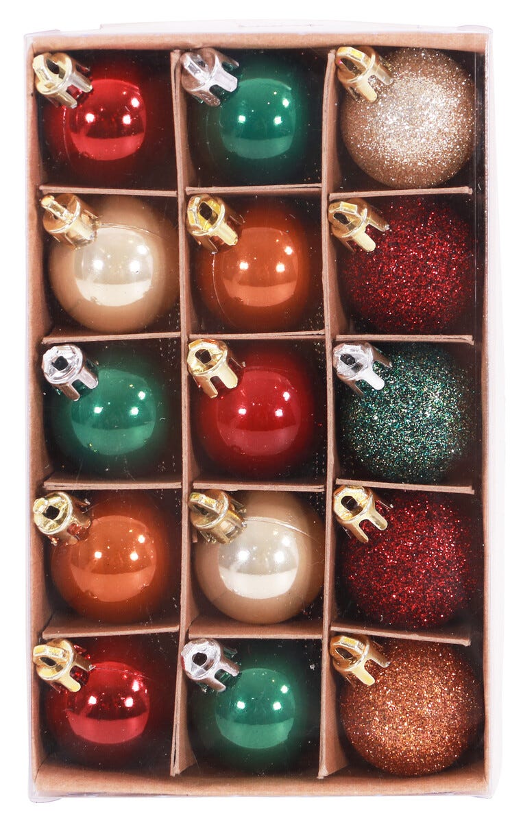 • Stor pakning med 15 julekuler av resirkulert plast.