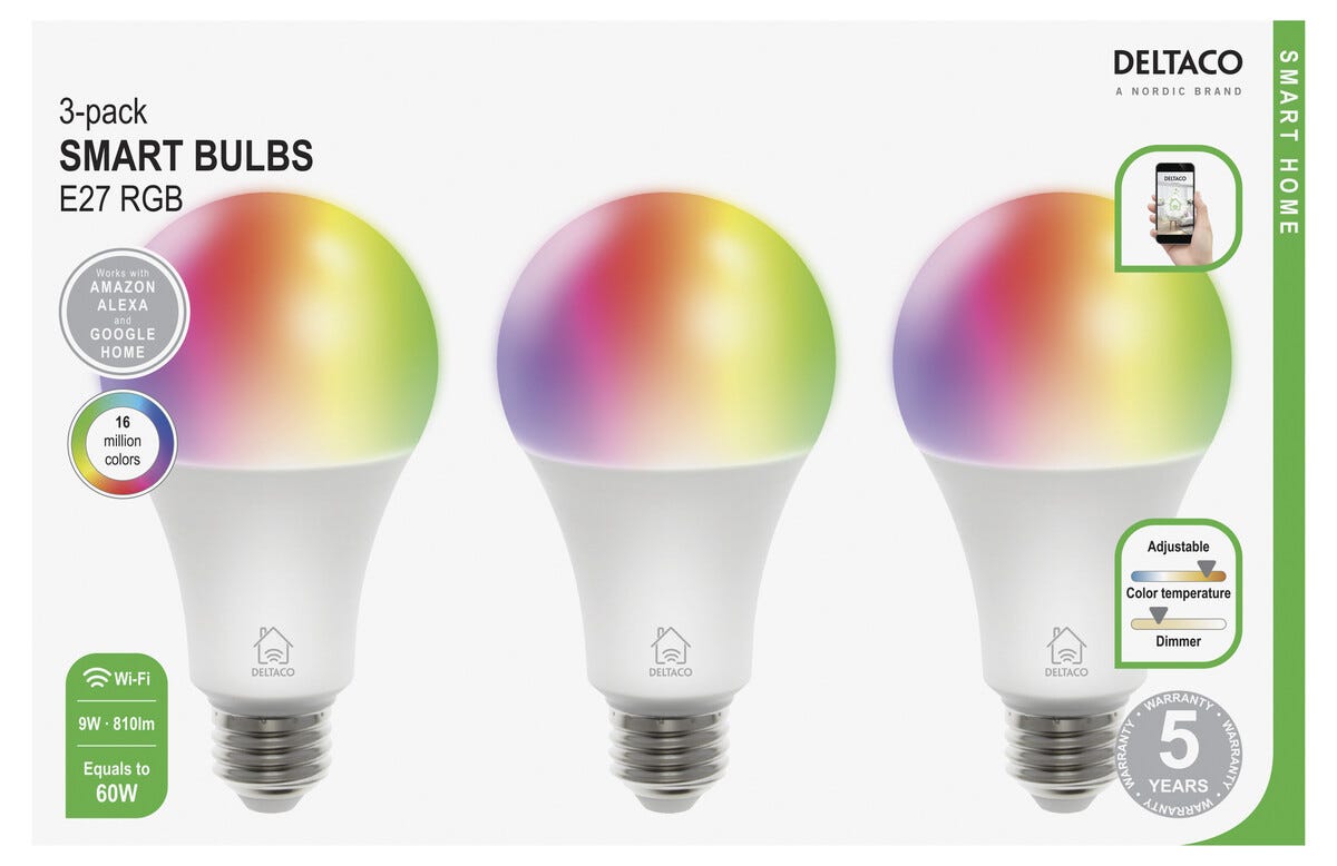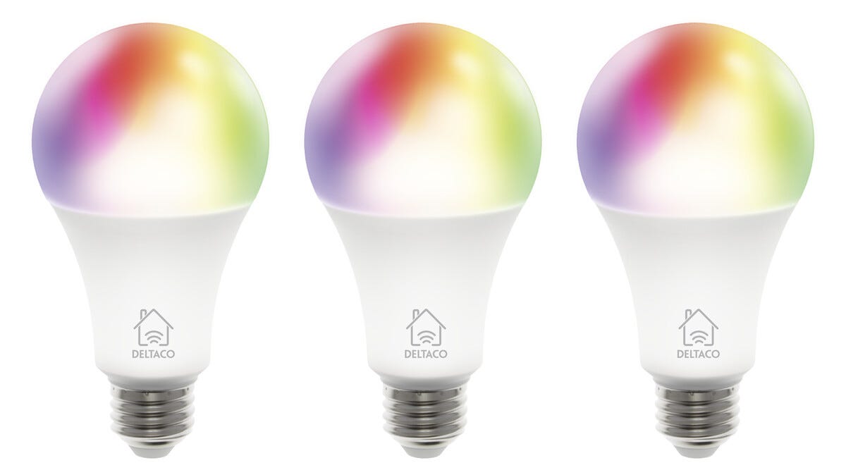 Deltaco Smart Home WiFi dimbar LED RGB E27 9 W, 3-pack
