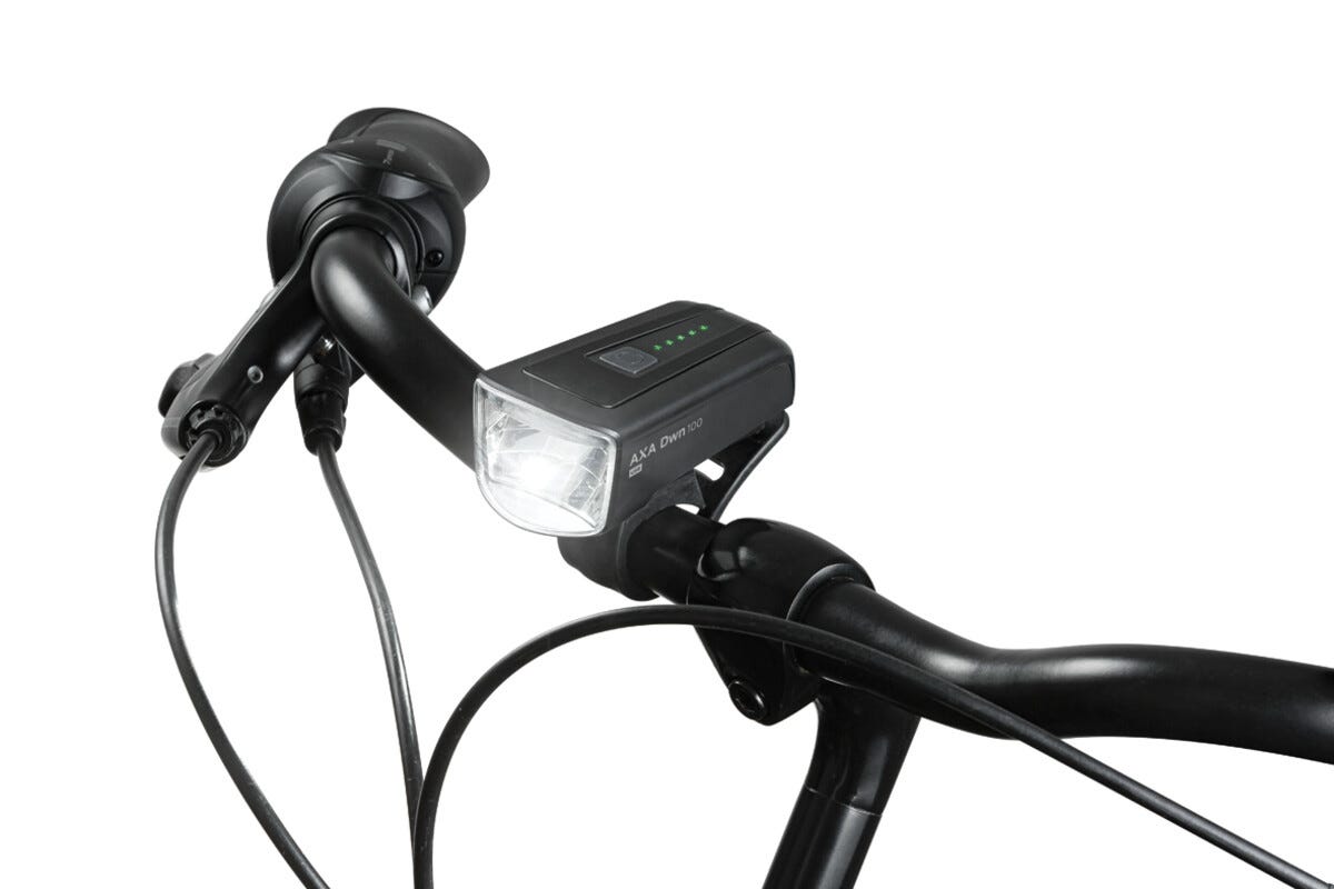 • AXA Dwn 100 laddningsbar cykellampa med batteriindikator (laddkabel ingår).