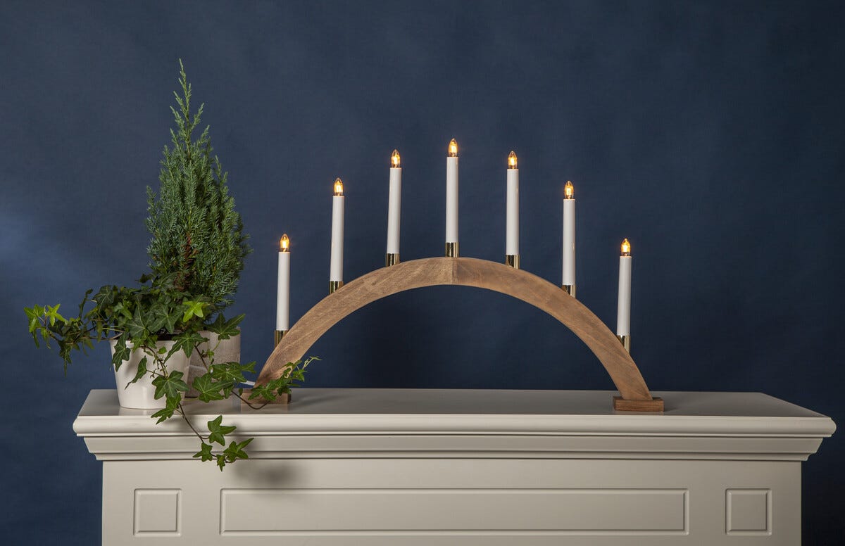 • Ljusstake Gillian – elegant ljusbåge i trä med mässingsbelagda ljushållare.