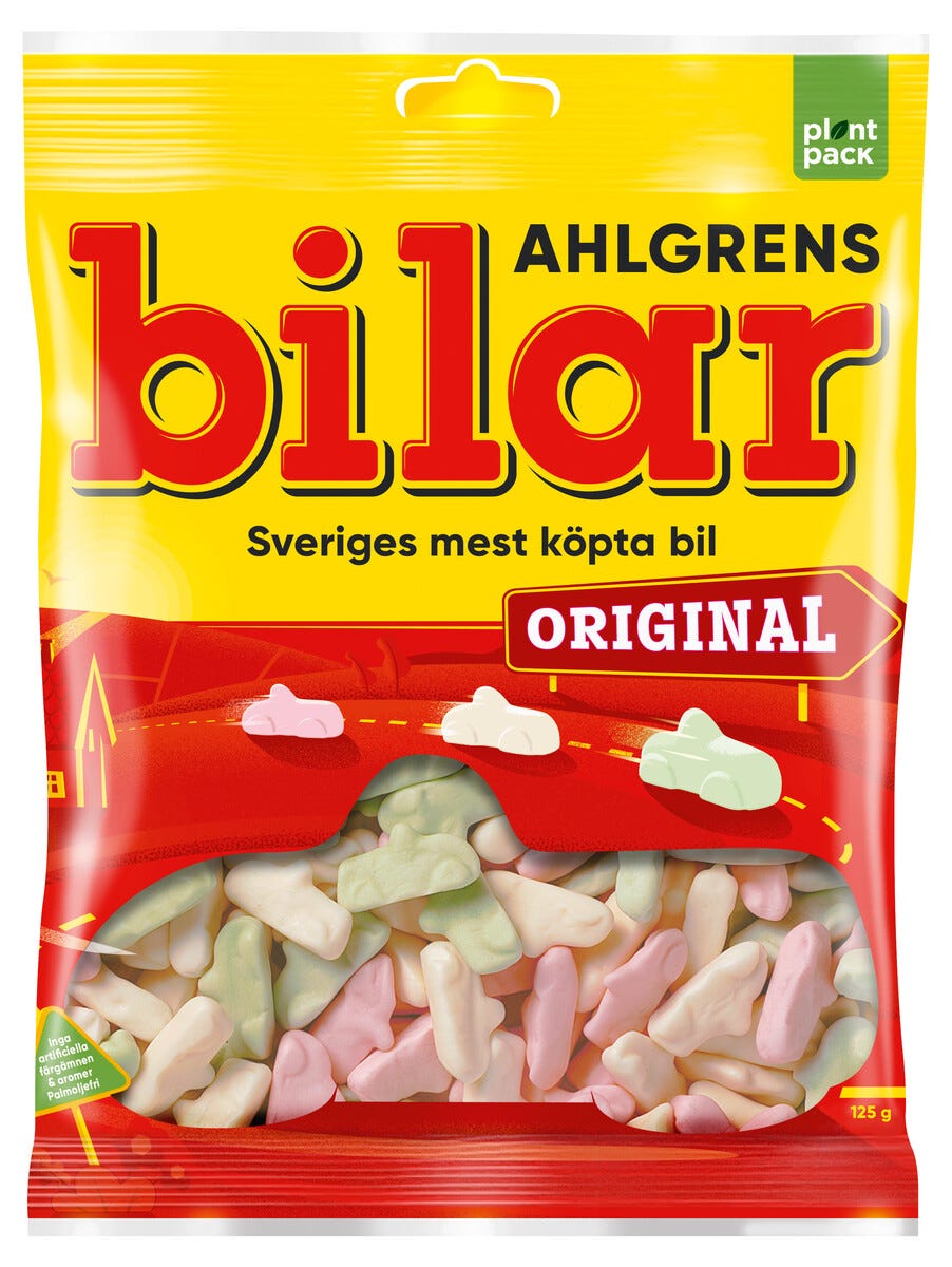 • Klassiskt, svenskt godis i form av sega bilar.