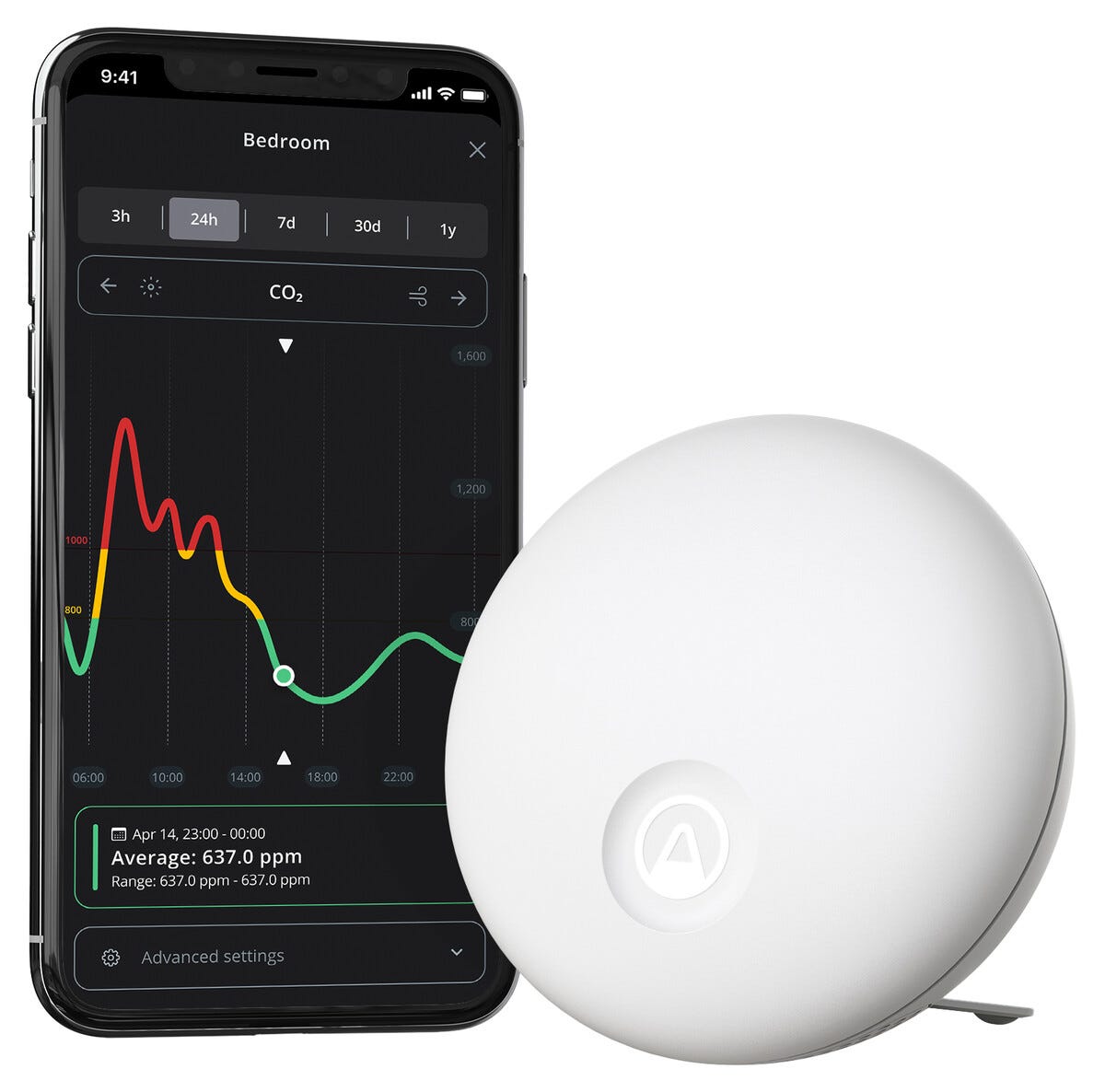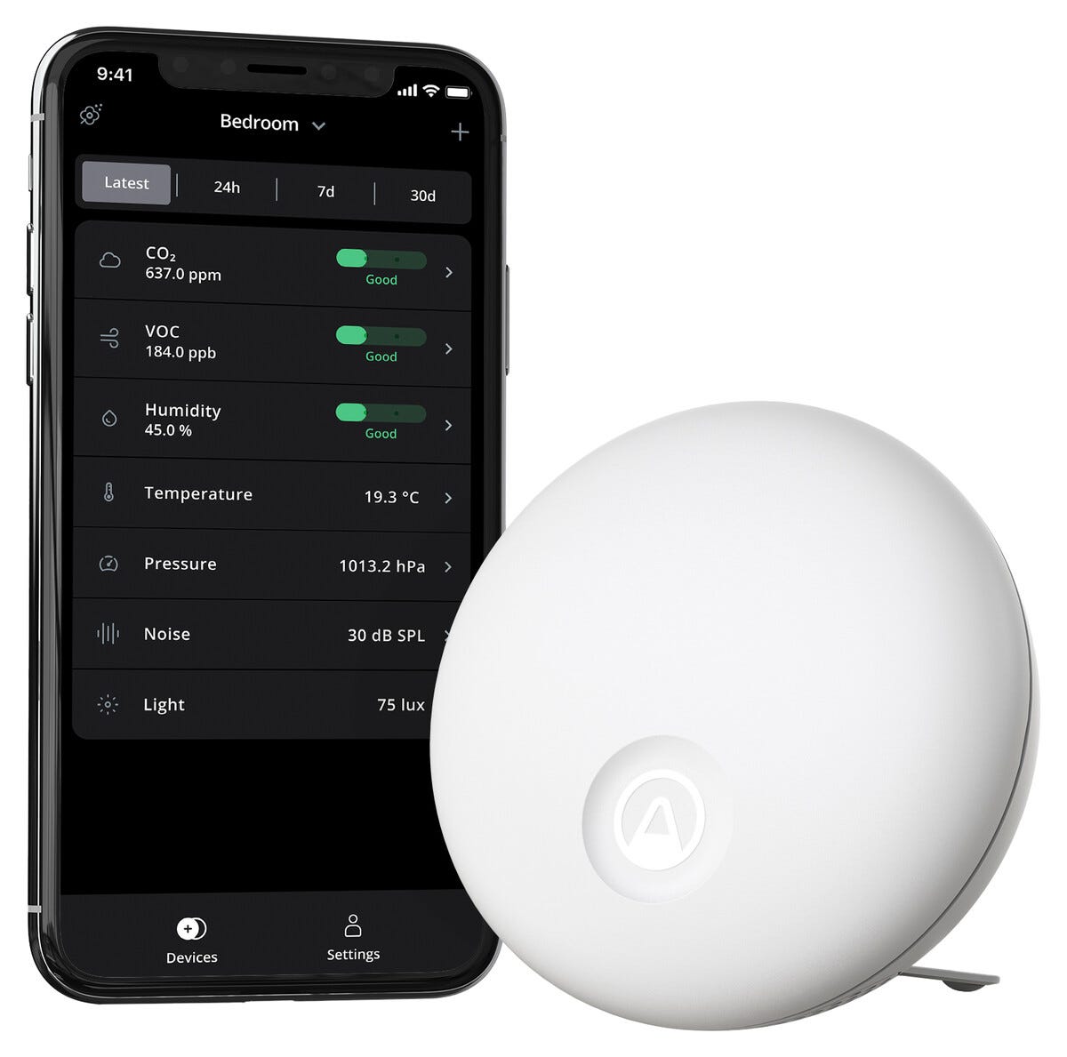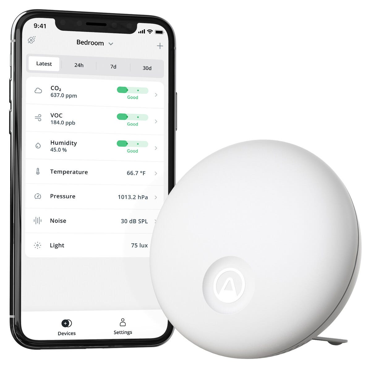 • Se värden som koldioxid, luftfuktighet, ljudnivå och temperatur direkt i mobilen.