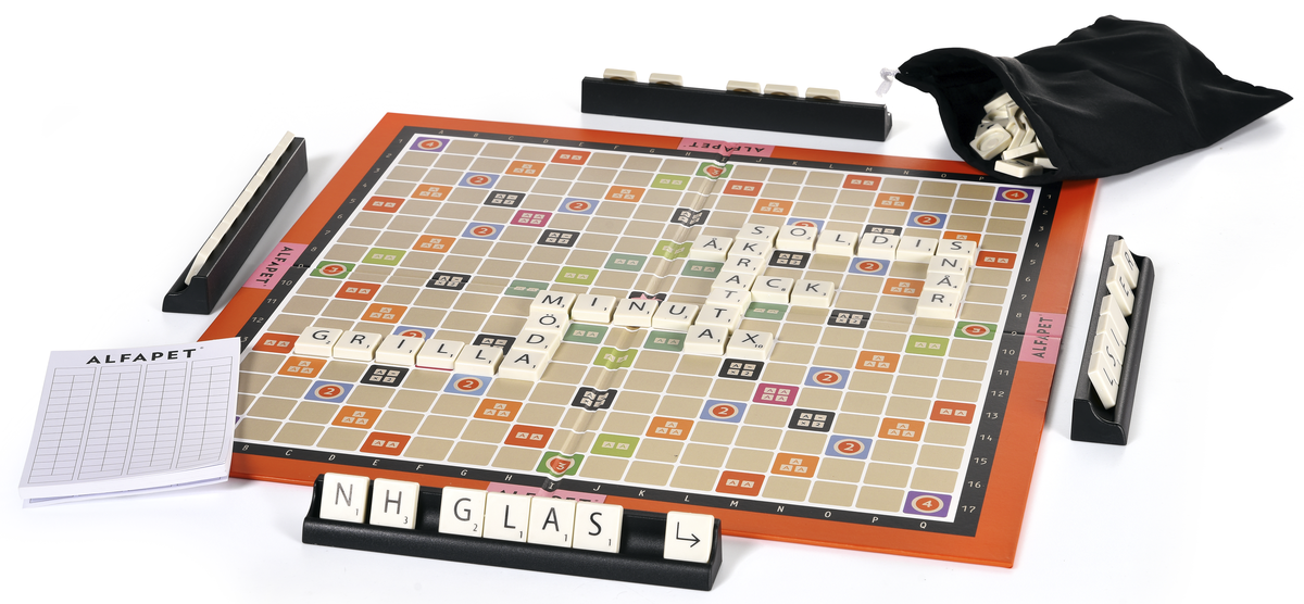 • Innehåller spelplan, bokstavsbrickor, hållare, tygpåse och protokollblock.