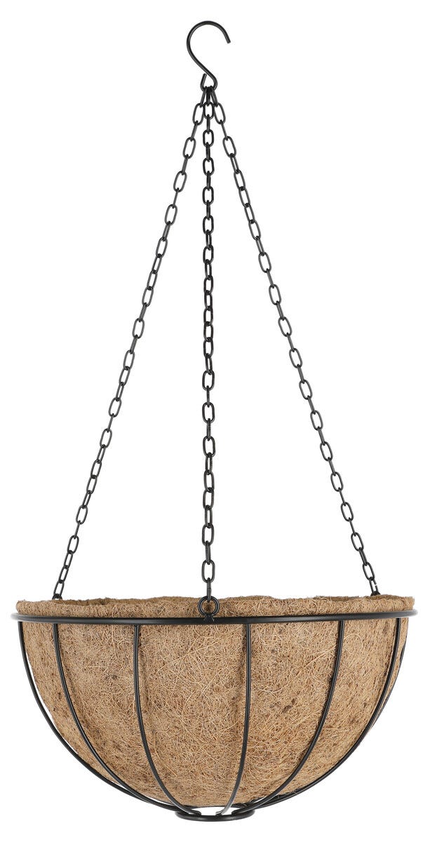 • Svartlackerad metallkorg med kedjor och fuktbevarande kokoskruka.