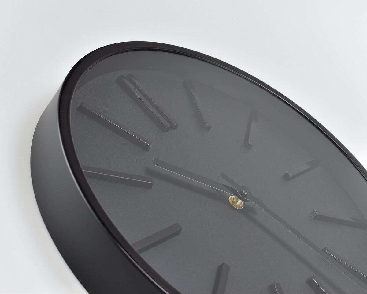 • Minimalistisk inredningsdetalj i mörk, avskalad design – väggur med tyst urverk.