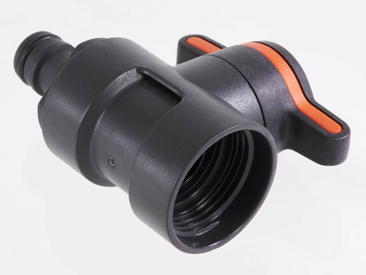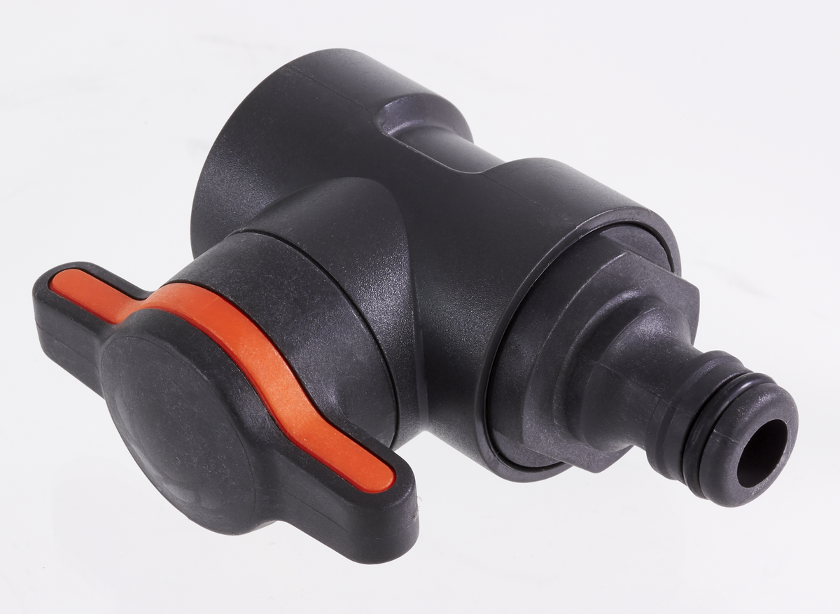Vred för reglering av vattenflöde. Gängad anslutning för rör/koppling till pump och 1/2" slangkoppling.