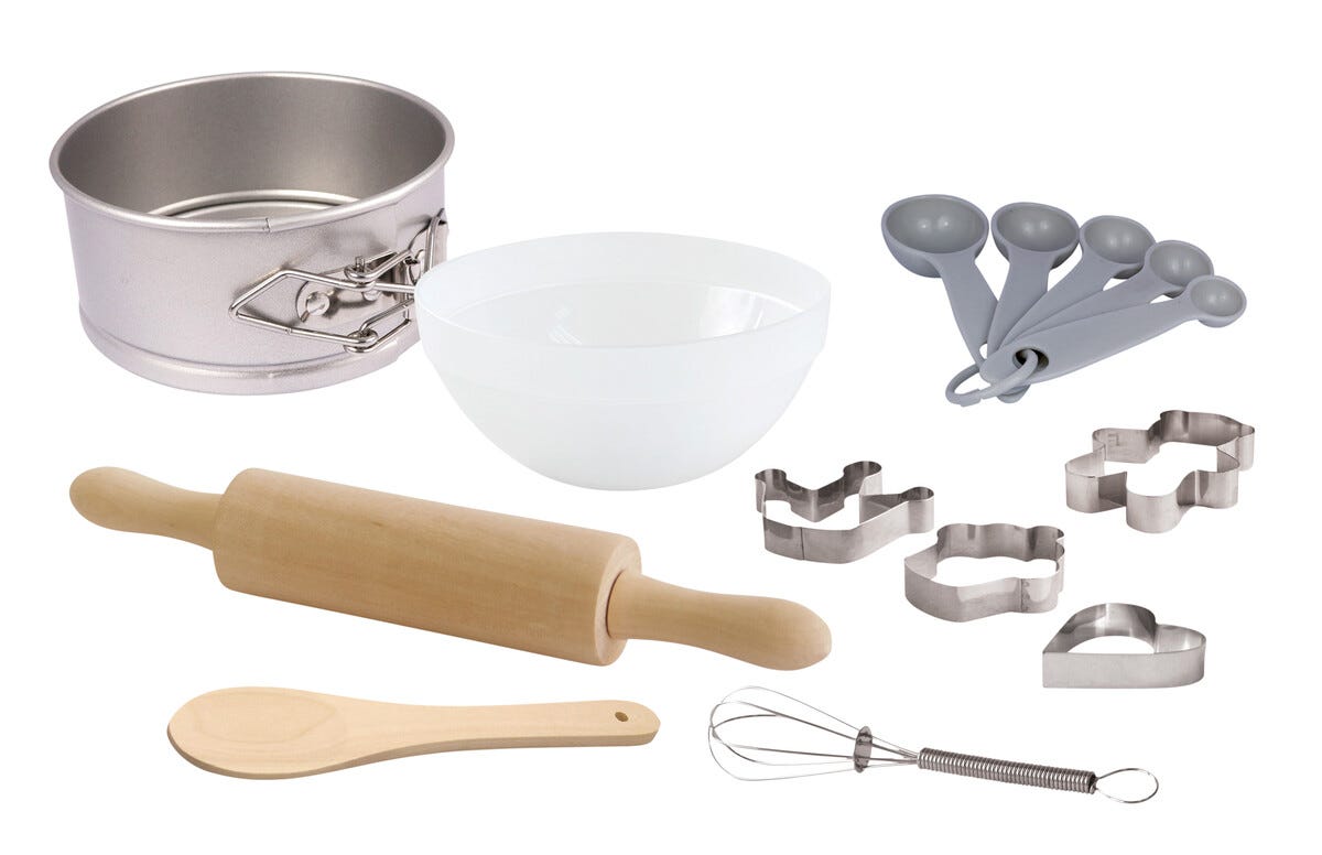 • Innehåller en skål, en kavel, en visp, måttskedar, kakformar och en bakform.