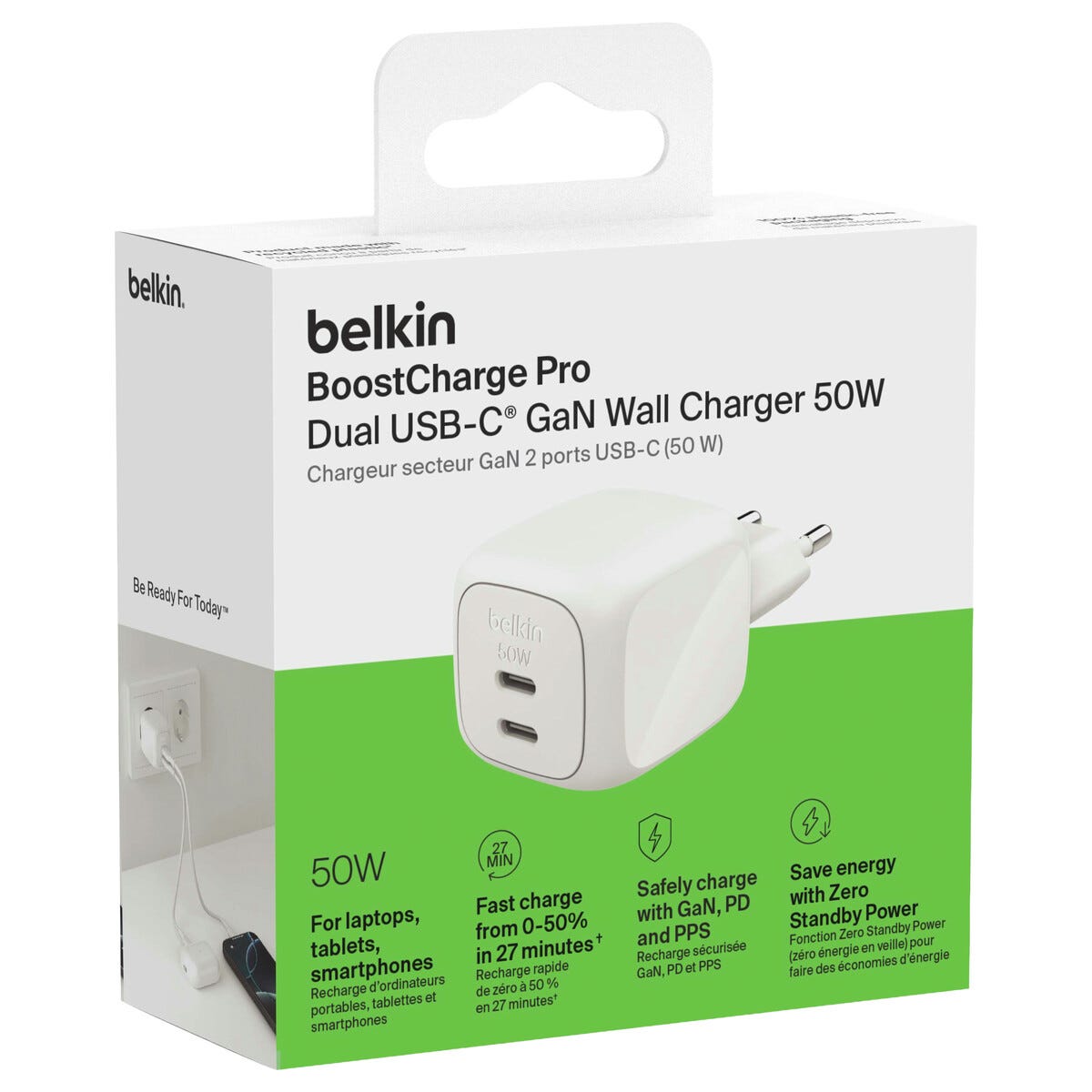 • Belkin BoostCharge Pro USB-C 50W väggladdare – kompakt och snabb.