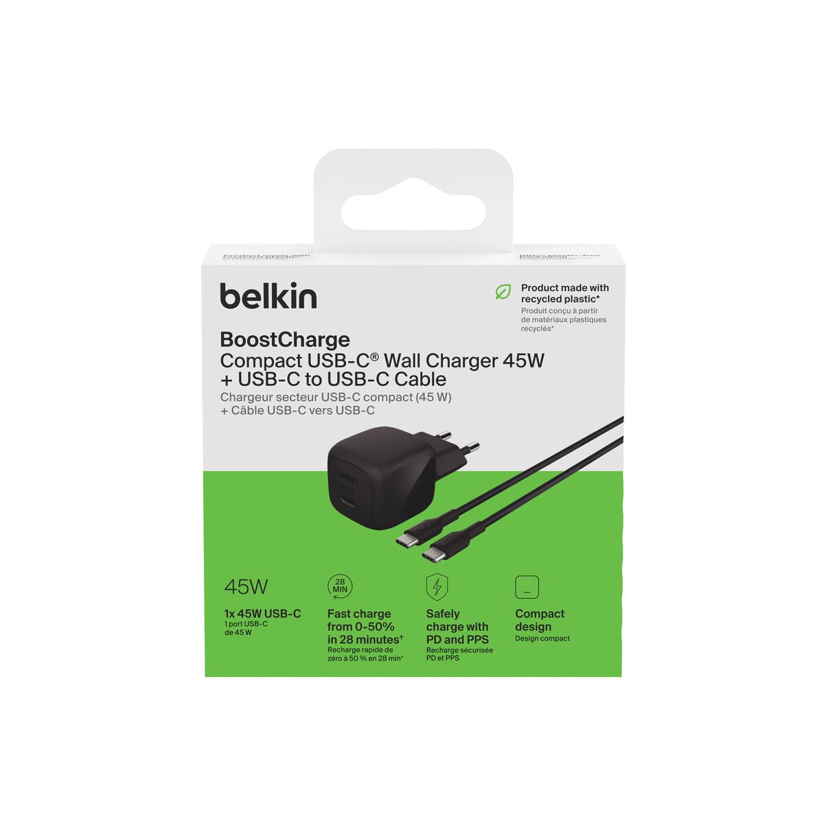 Belkin BoostCharge USB-C laddare 45W med kabel, WCA013kq1MBK-B6