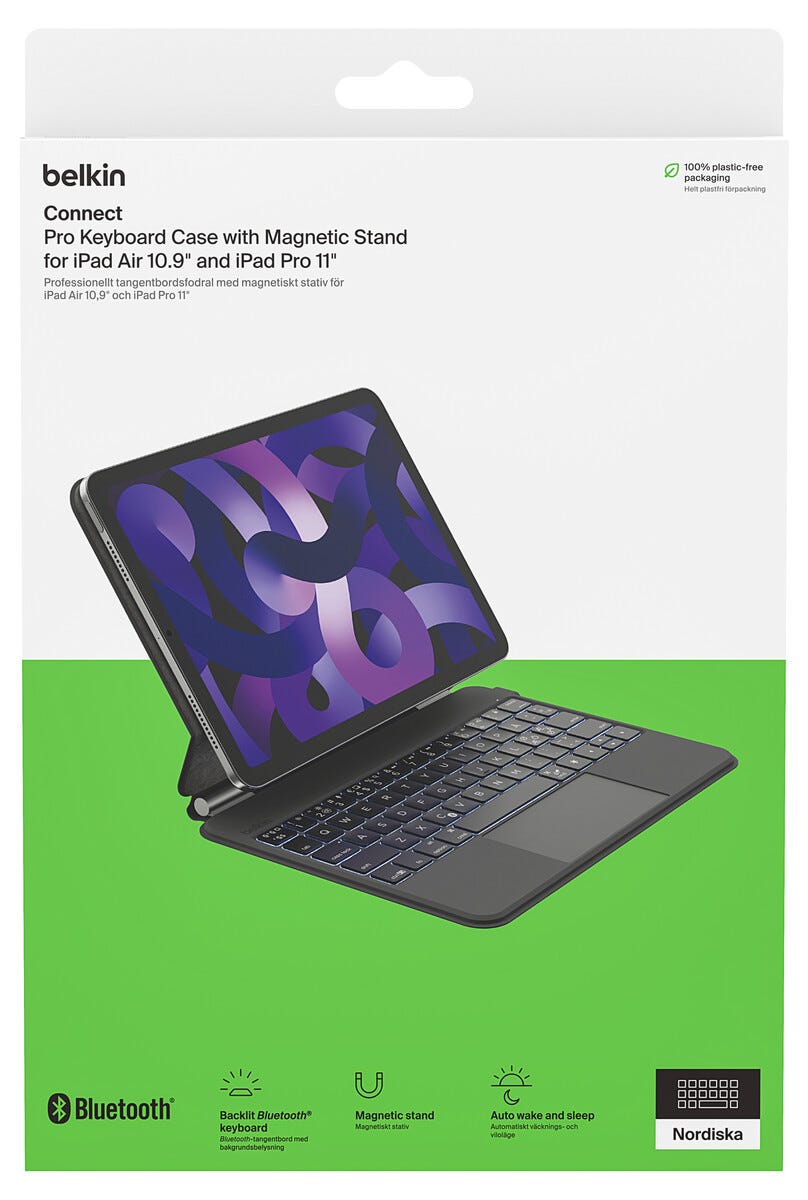 • Belkin Connect tangentbordsfodral Pro med bakgrundsbelyst Bluetooth-tangentbord.