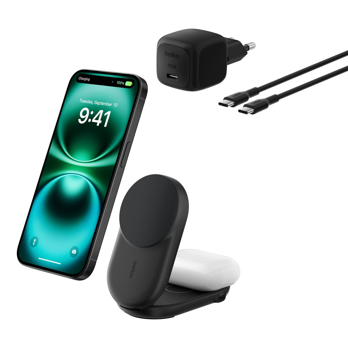 • Snabbladdare för både iPhone och AirPods – smidig hemma och på resan.