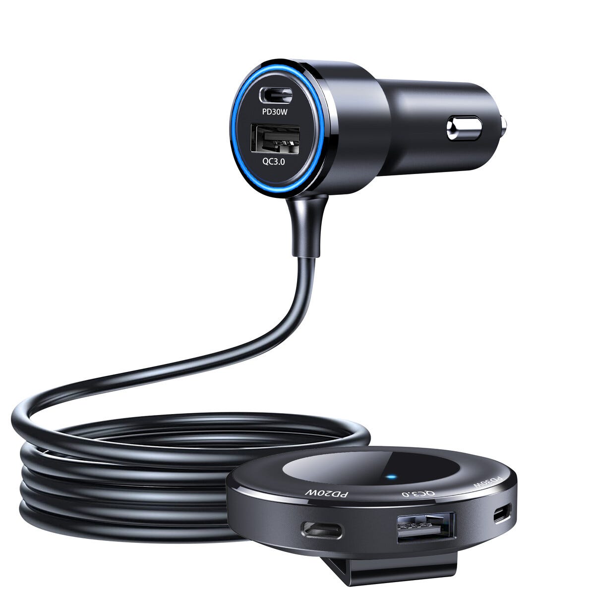 • Ladda i framsätet och baksätet samtidigt – sladdlängd 1,5 meter.