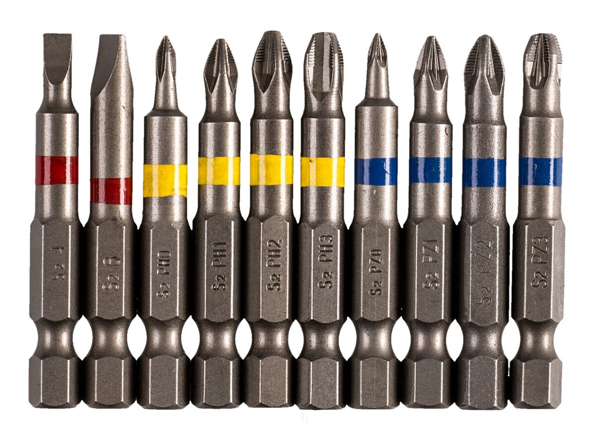• Långa färgkodade bits av S2-stål.