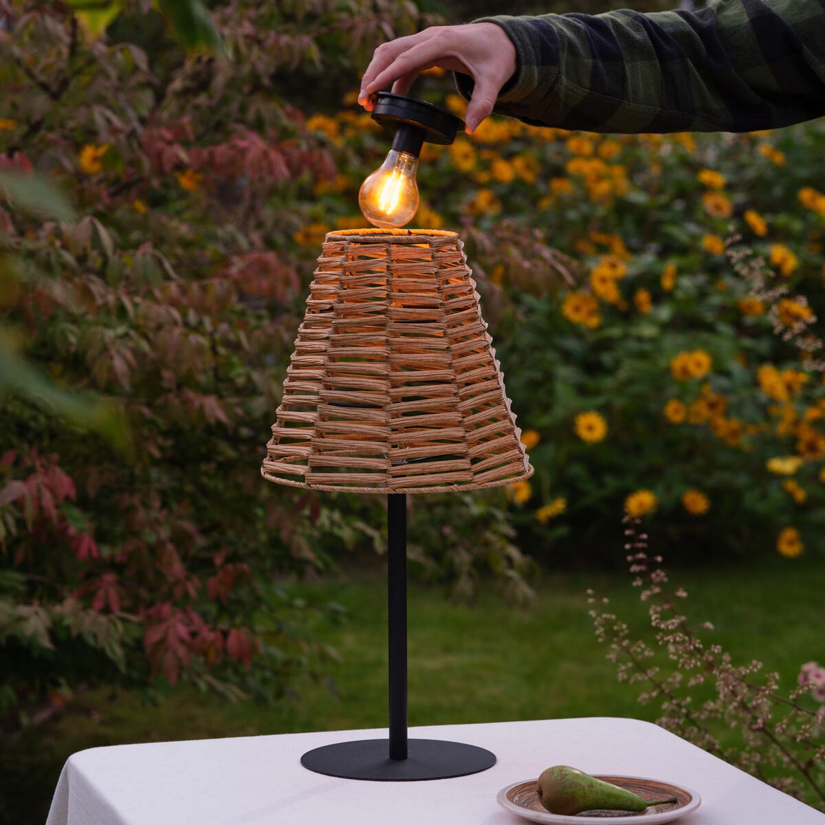 • Bordslampa i metall och konstrotting – dekorationsbelysning utomhus.