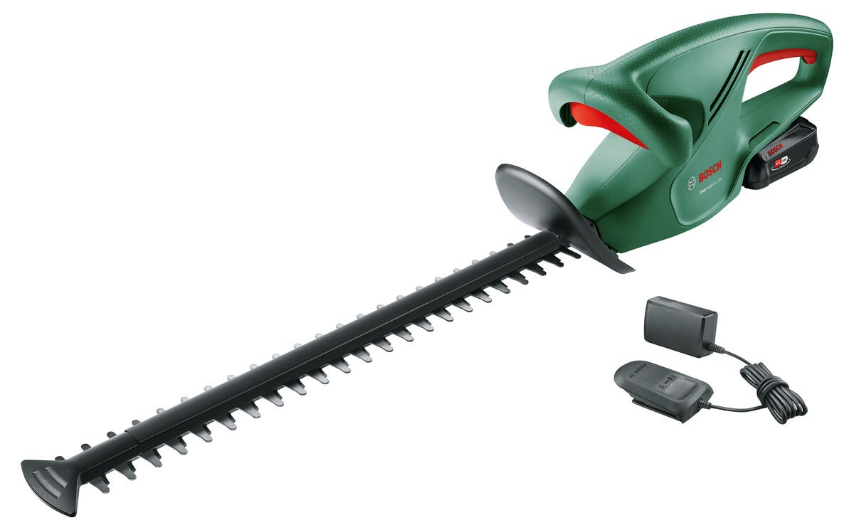 • Bosch Easy HedgeCut 18-45 – sladdlös häcksax med låg vikt (2,5 kg) och ett 45 cm långt svärd.