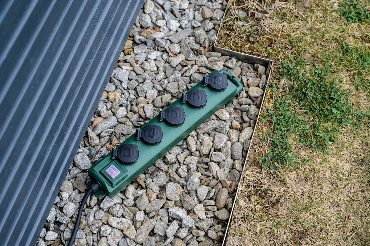 • Vädertålig grendosa med 5 vinklade uttag, godkänd för utomhusbruk.