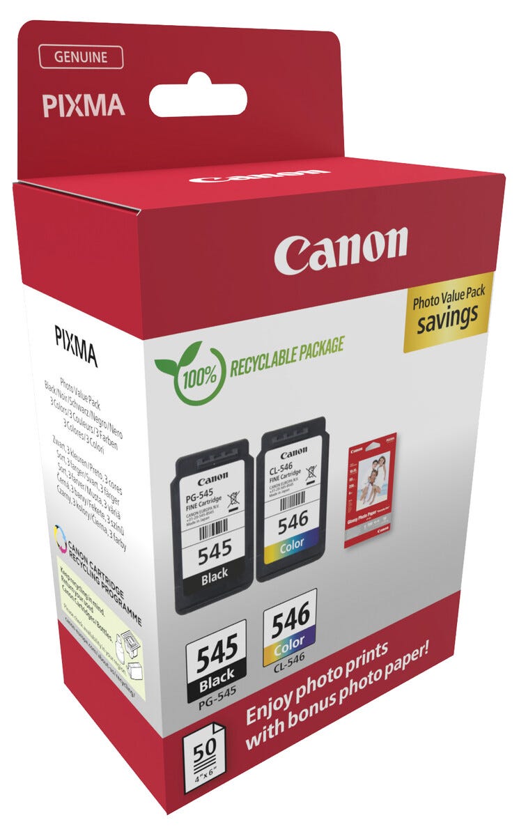 • Innehåller färgpatron CL-546, svart CL-545 samt 50 ark glansigt fotopapper.
