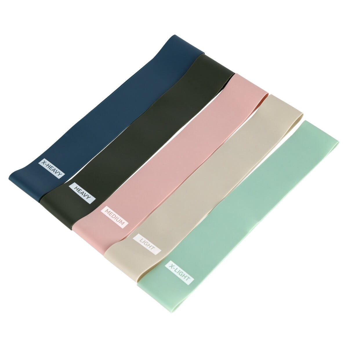 • 5 elastiska gummiband i olika styrkor för helkroppsträning hemma.