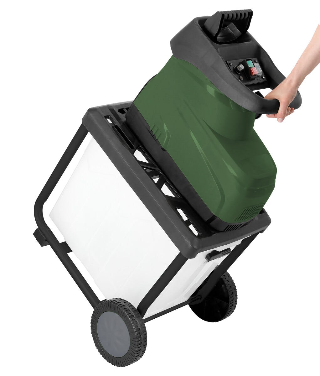 • Elektrisk kompostkvarn som effektivt finfördelar trädgårdsavfall till flis.