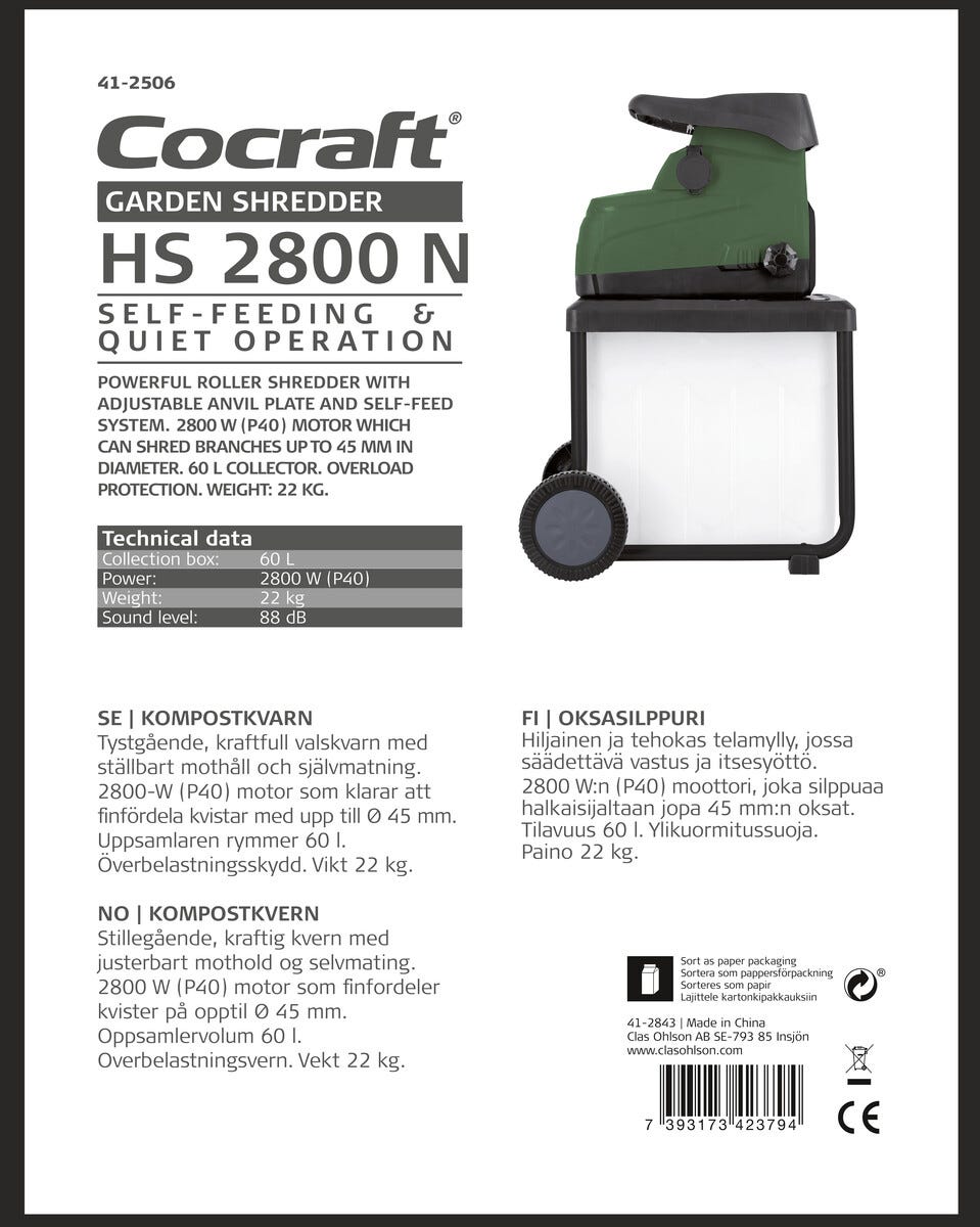 • Cocraft HS 2800 N – kraftfull kompostkvarn med 2800 W-motor.