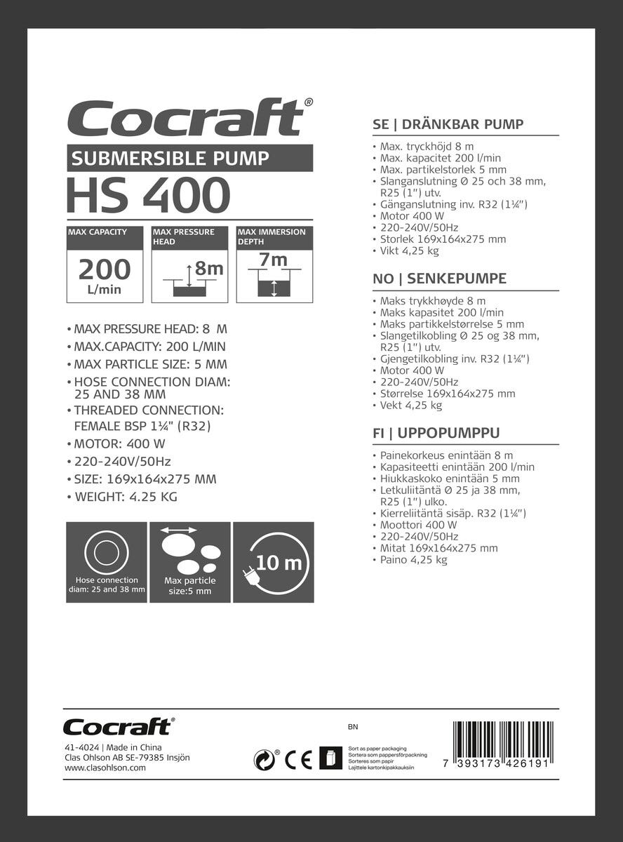 Cocraft HS 400 dränkbar pump med flottör, elektrisk