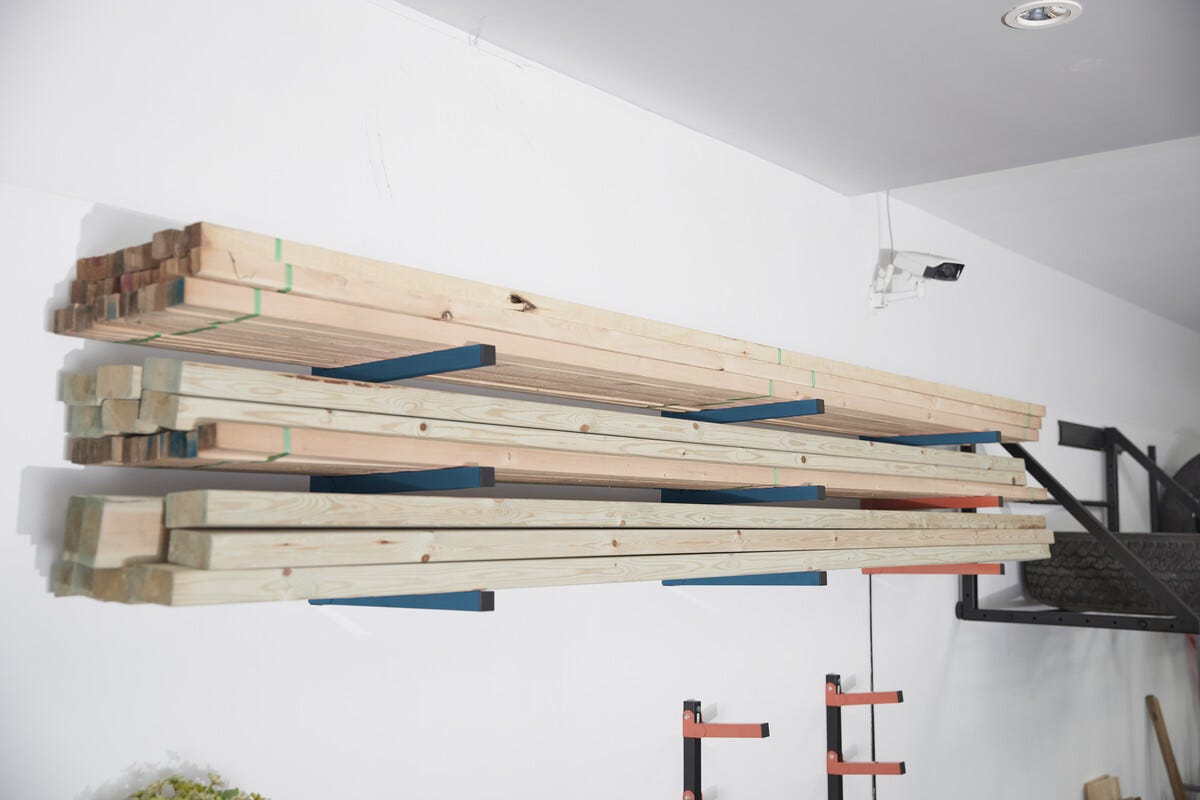 • Stabilt virkesställ med 3 nivåer – för virke, lister, plaströr och mycket mera.