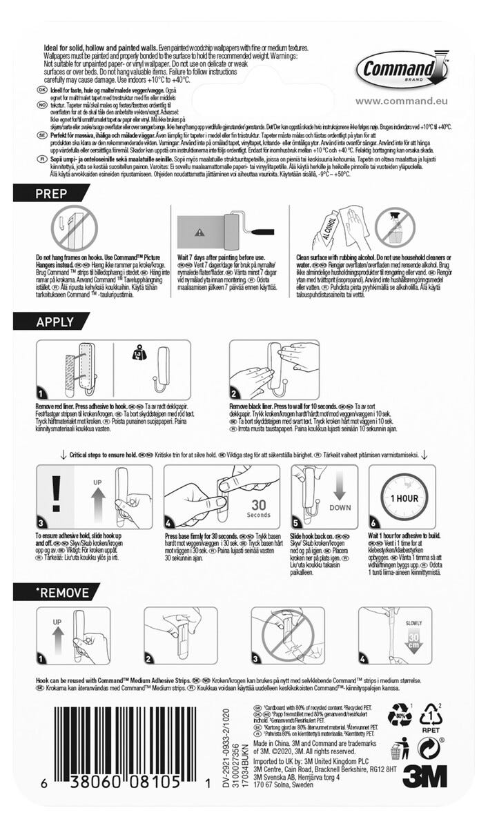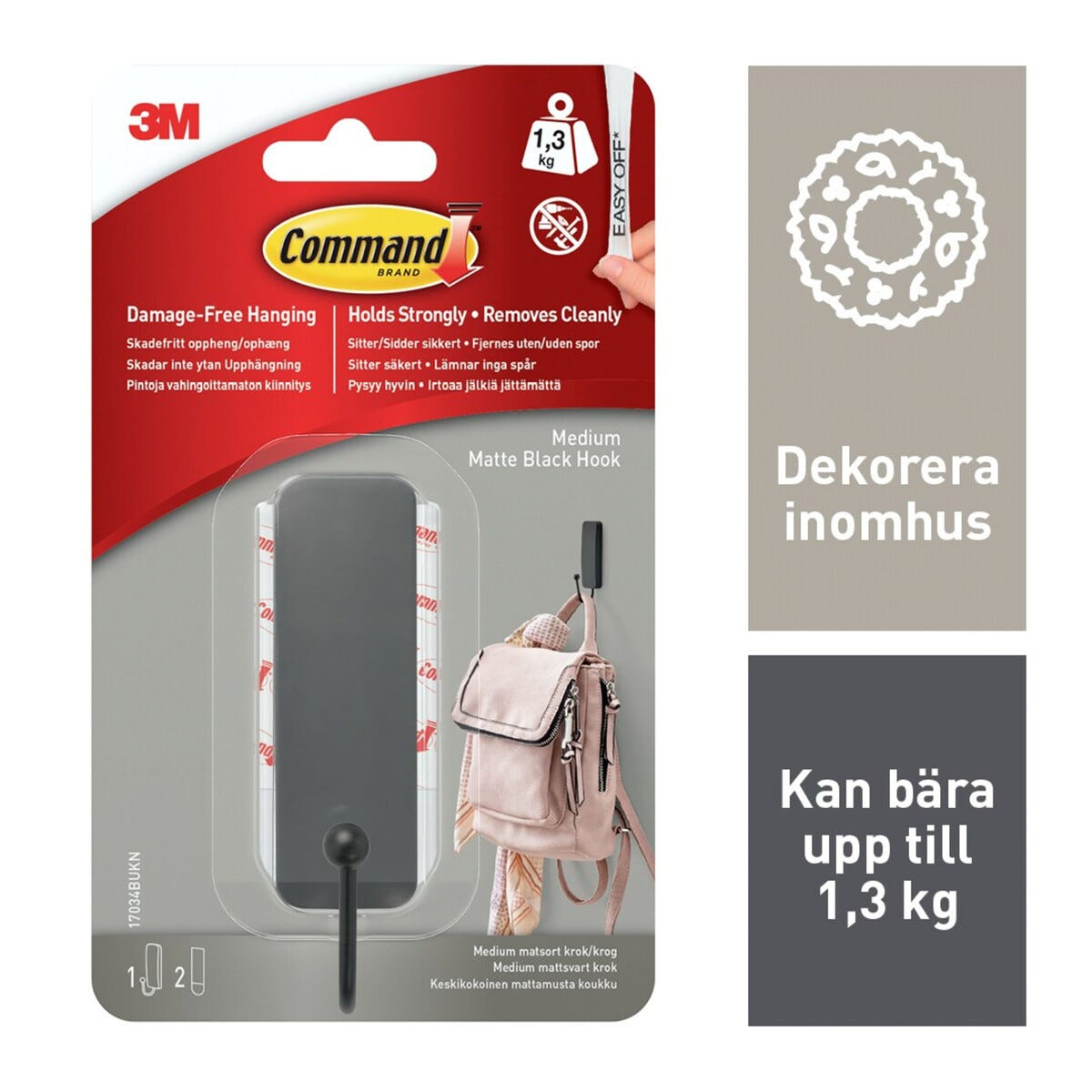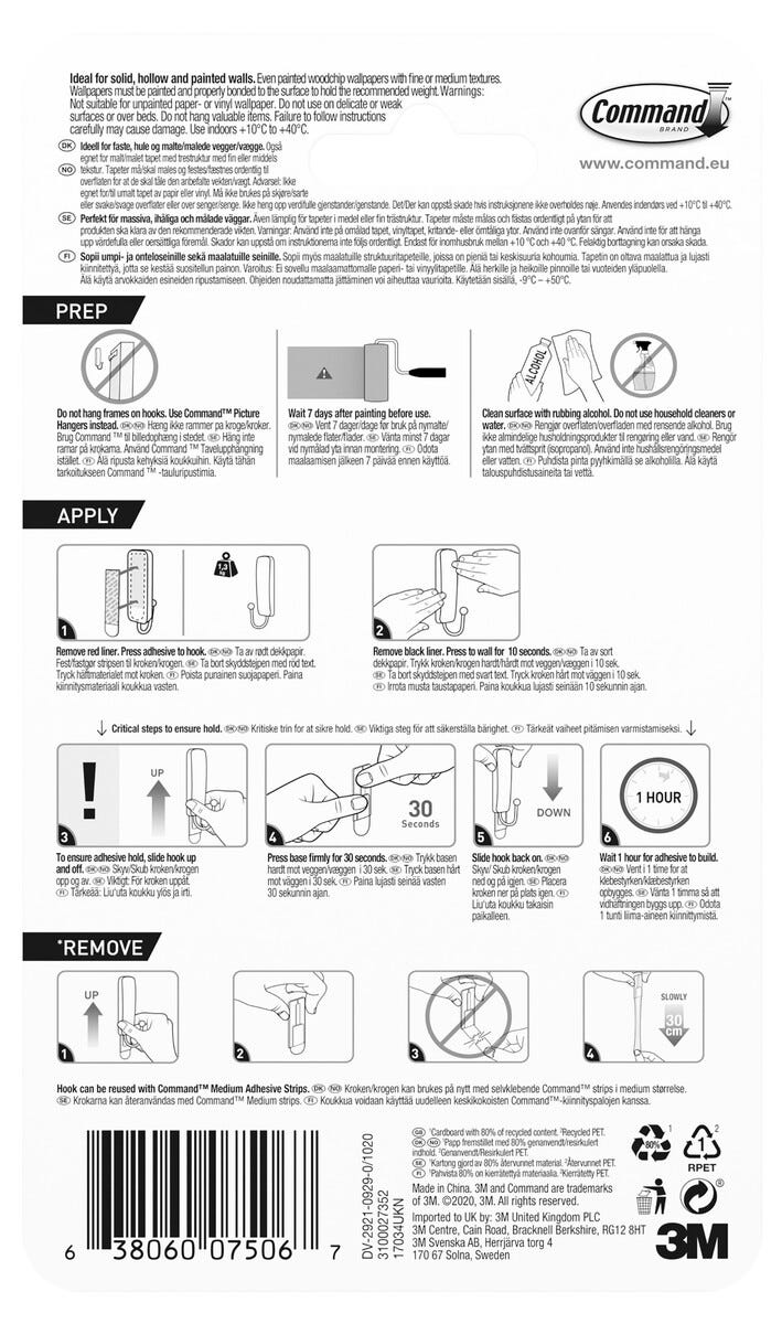 • Innehåller 1 krok och 2 mediumstrips. För inomhusbruk. Finns i flera färger.