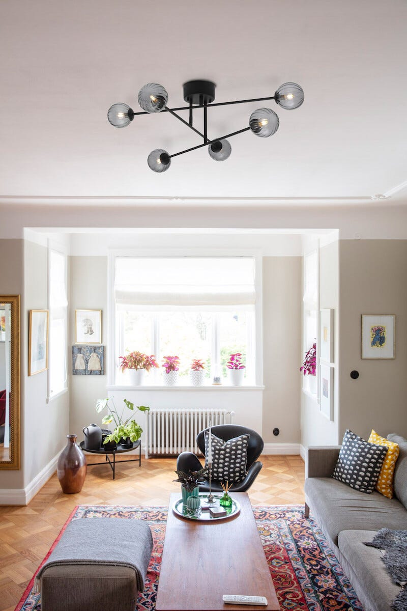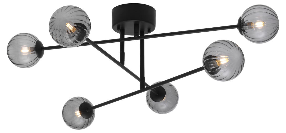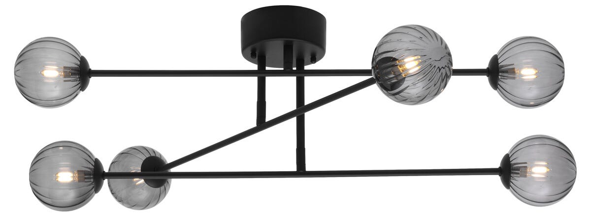 • Baton Rib takplafond i svartlackerad metall med rökfärgade glasglober.