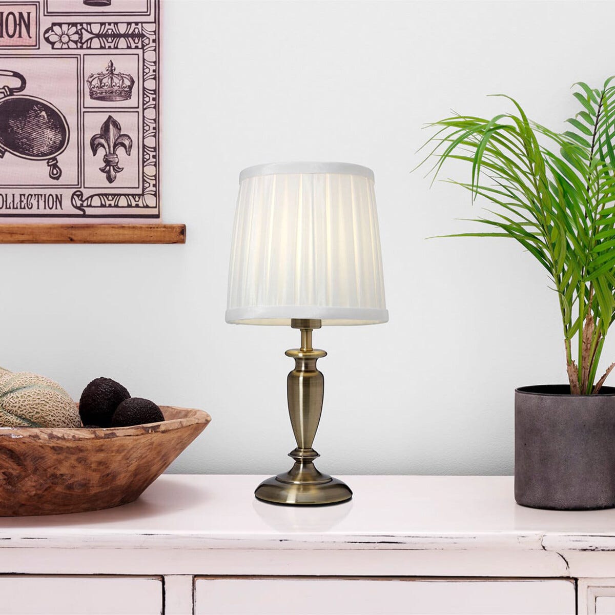 • Lampans fot finns i antikmässing eller krom – välj den som passar hos dig.