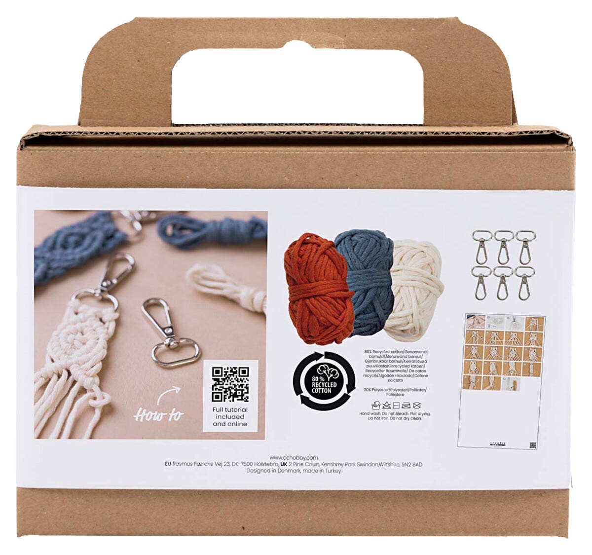 • Innehåll: Makramésnöre i 3 färger, 6 nyckelringar och instruktioner.