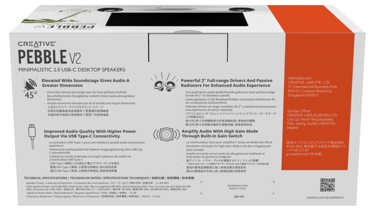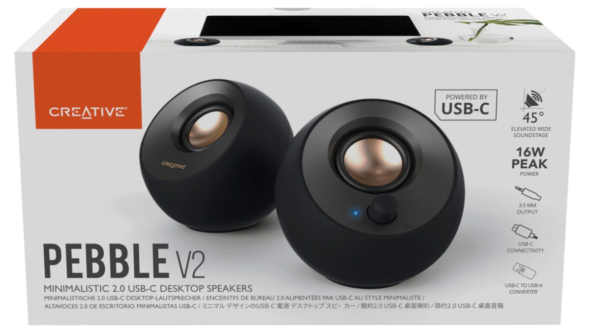 • Creative Pebble V2 datorhögtalare med bas – USB-C till USB-A-adapter ingår.