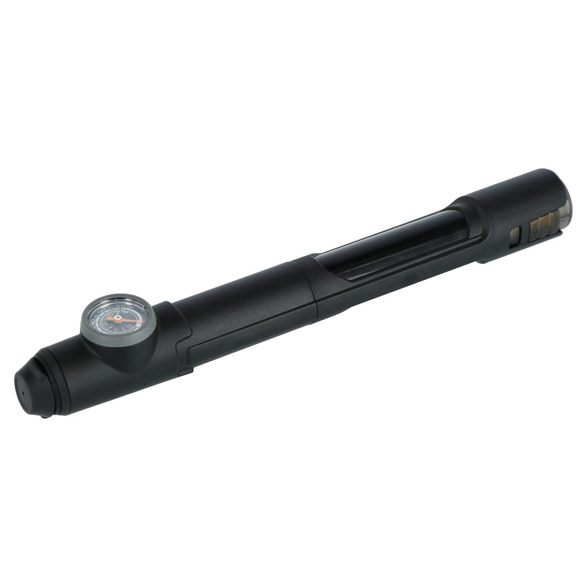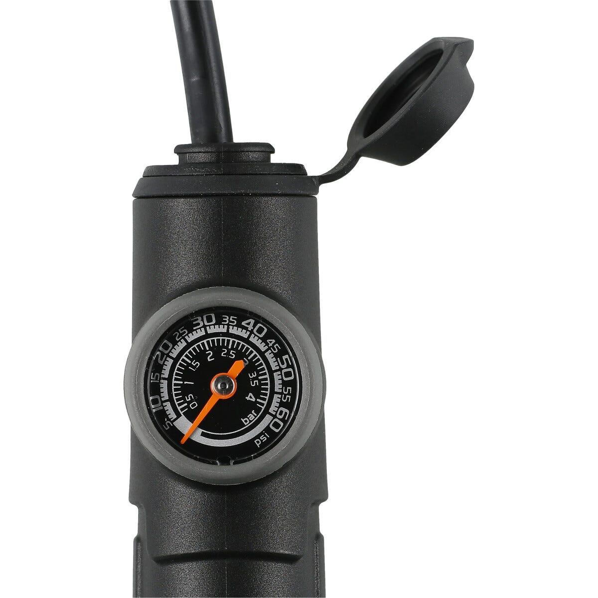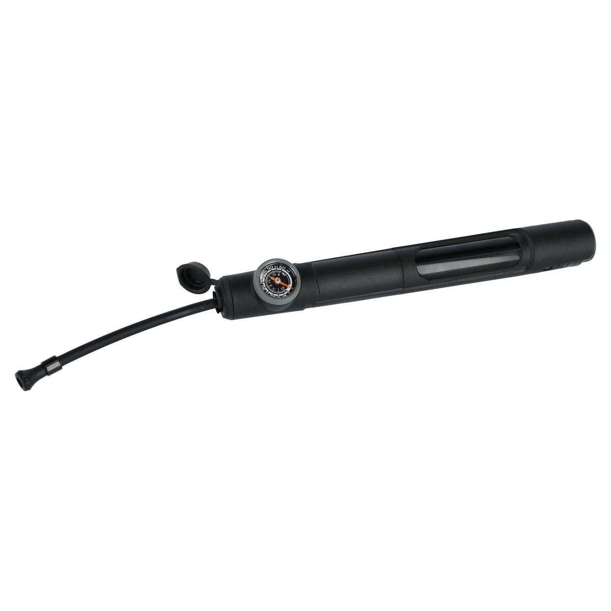 • Cykelpump med tryckmätare, manometer – visar tryck i både bar och PSI.