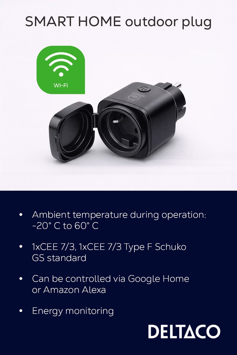 • Deltaco smart plug utomhus med WiFi och energimätning.