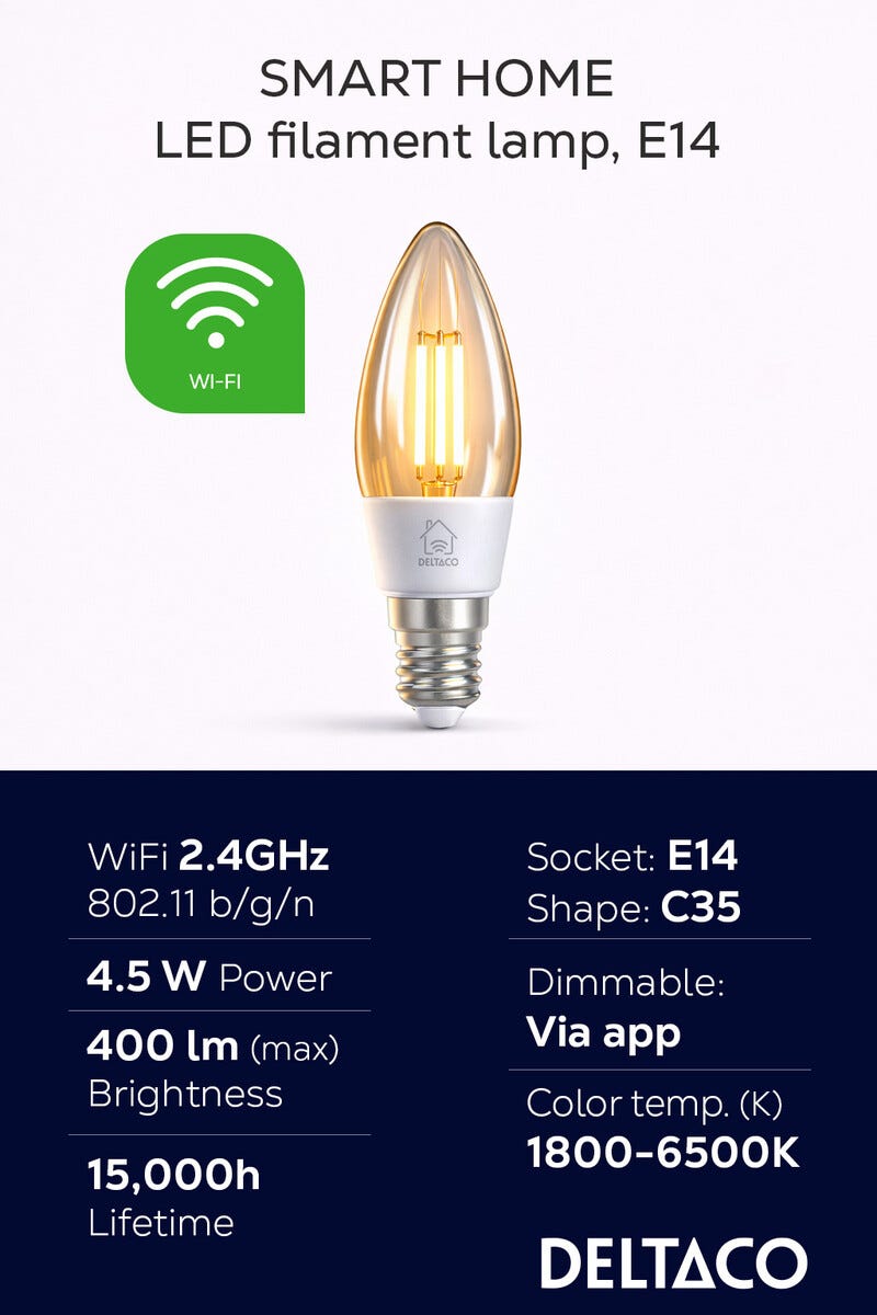 Deltaco Smart Home WiFi dimbar LED-filament E14 4,5 W