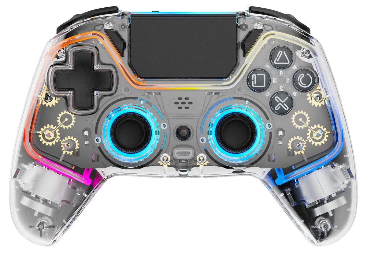 • Trådlös PS4-kontroll med anpassningsbar RGB-belysning och 3D-joystick.